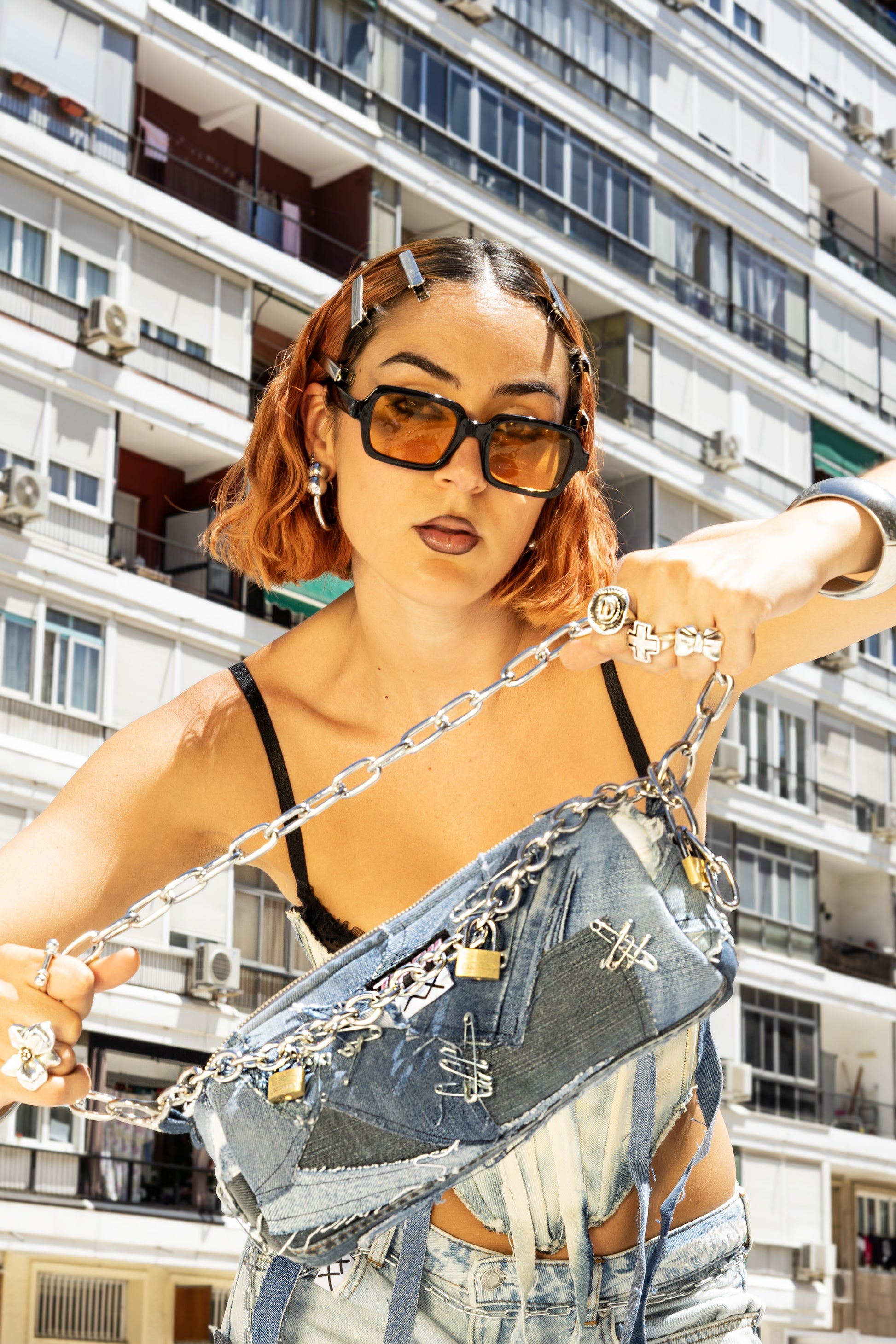 Denim patchwork fabric made from carefully selected left over destroyed denim. Combined with chains, safety pins and locks. 🔒 🧷⛓️👖