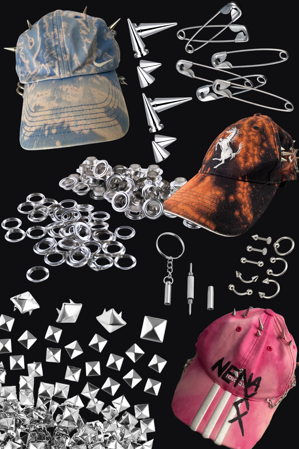 This kit gives you everything to transform any cap into a NENA-level punk piece. No perfect lines. No instructions for symmetry. Just tools, hardware and chaos.