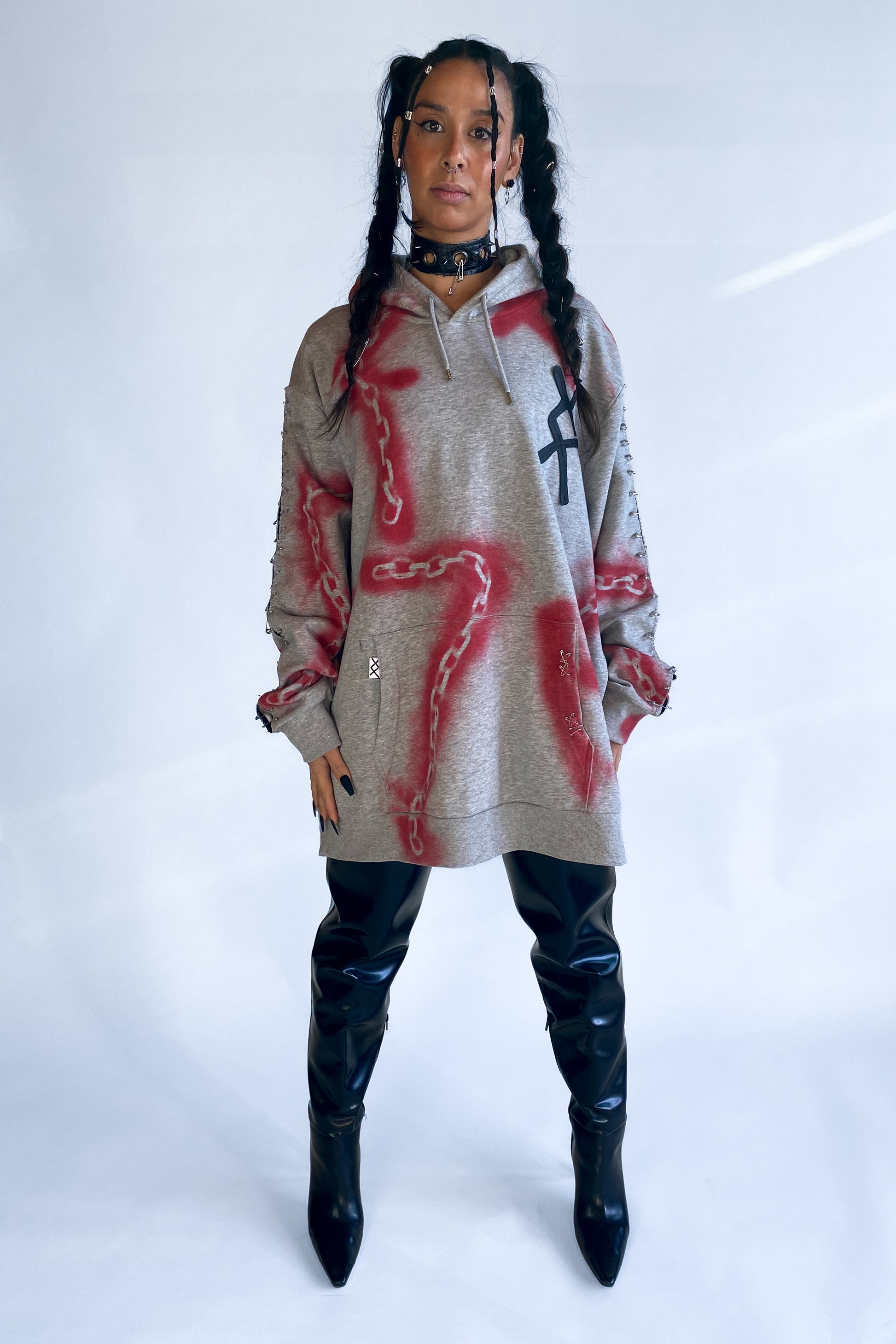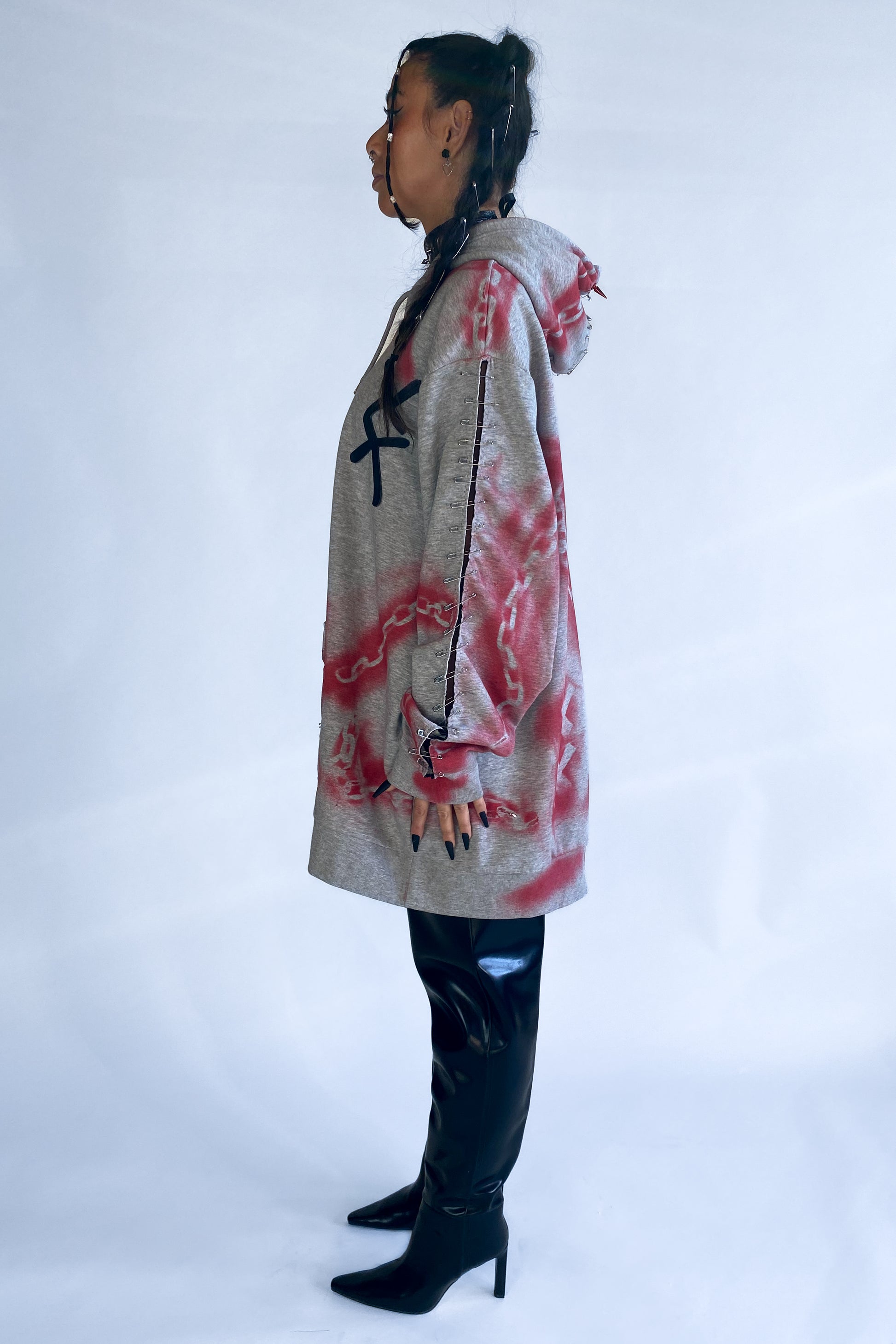 "Don't get chained up" Upcycled Deadstock Grey/red Hoodie