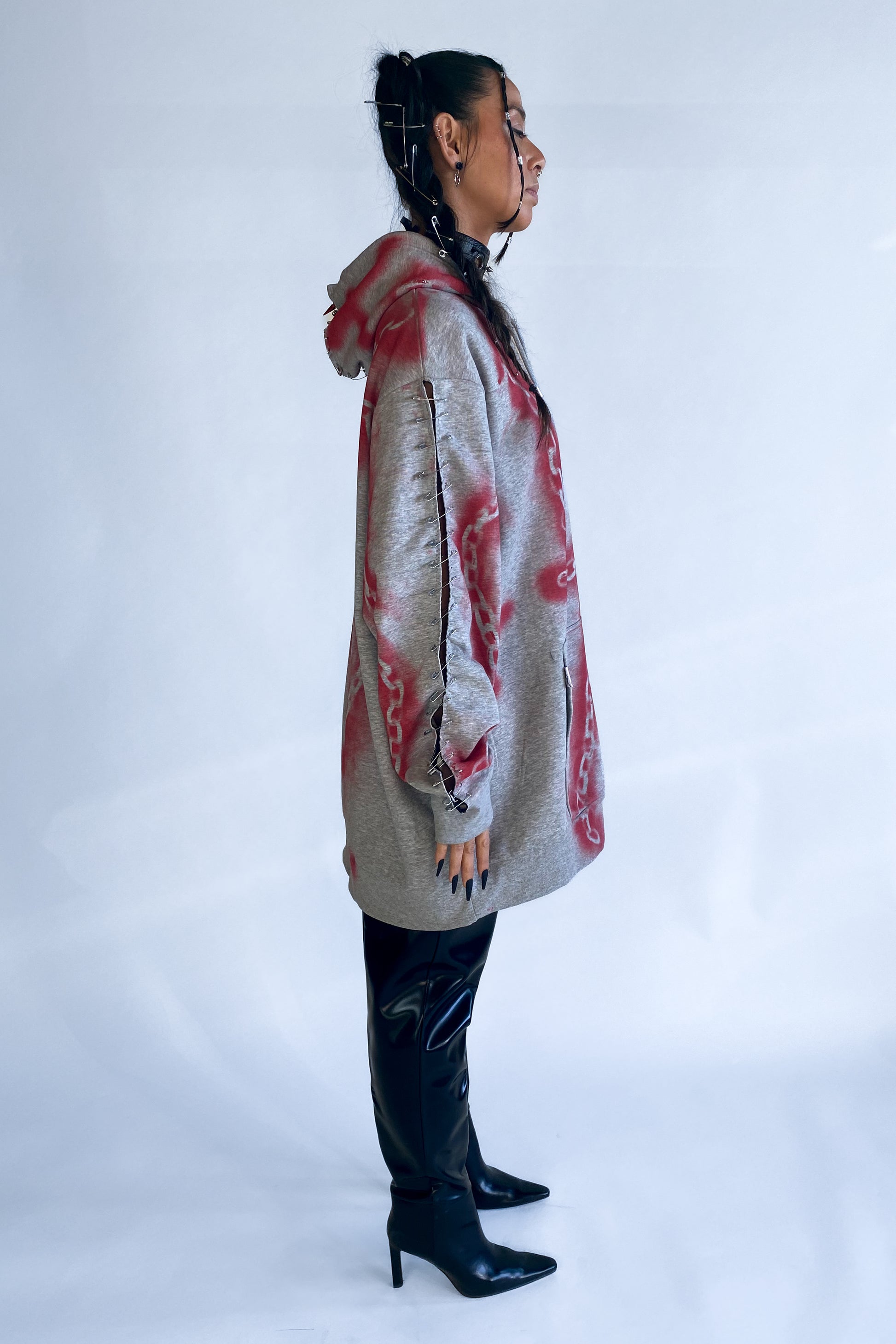 Each hoodie is hand-customized and spray-painted, ensuring that no two are exactly alike. Crafted from high-quality upcycled deadstock fabric, this hoodie gives new life to surplus materials that might otherwise go to waste. The grey color offers a versatile base, making it easy to pair with anything in your wardrobe while still standing out with its unique details.