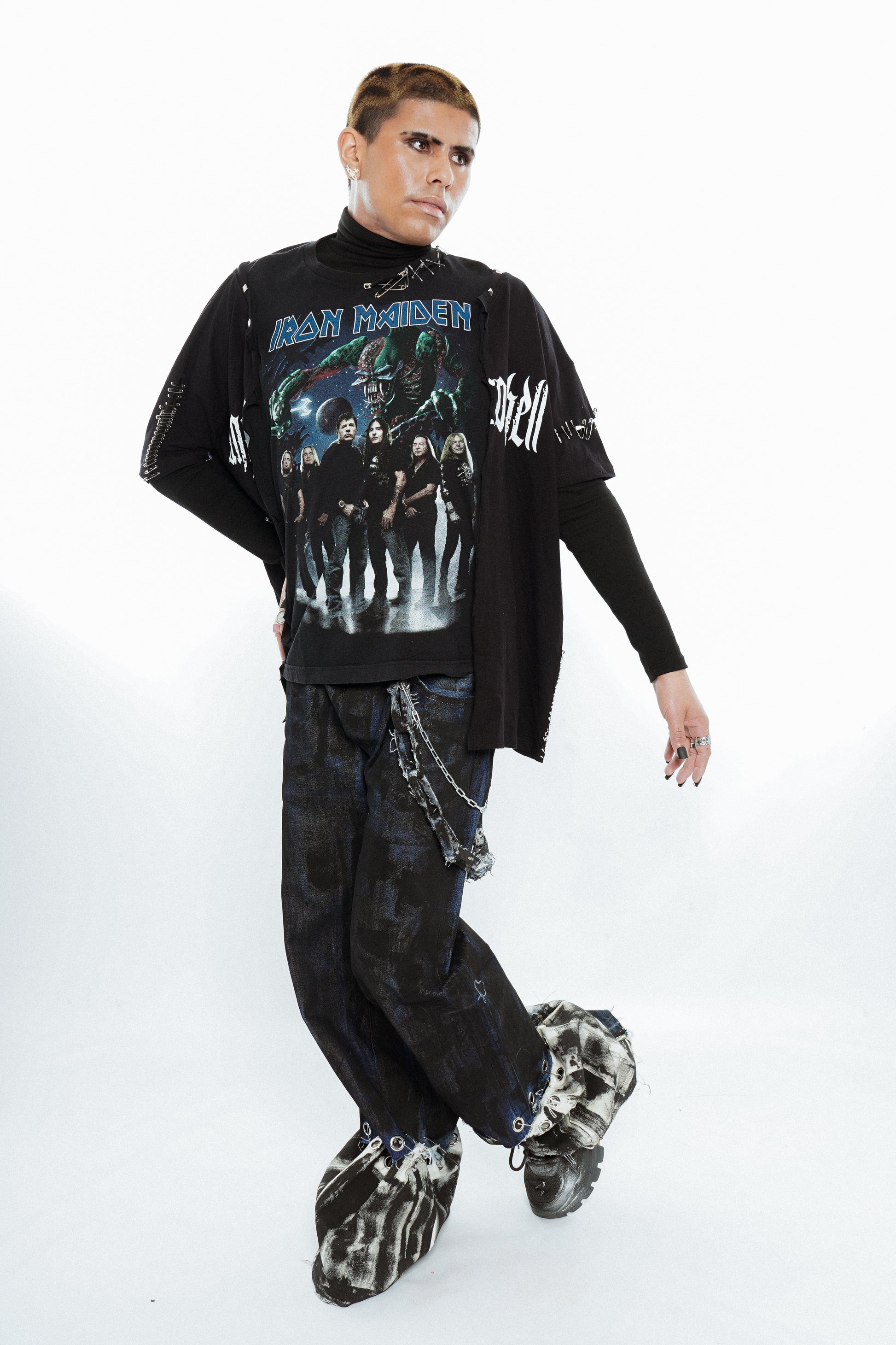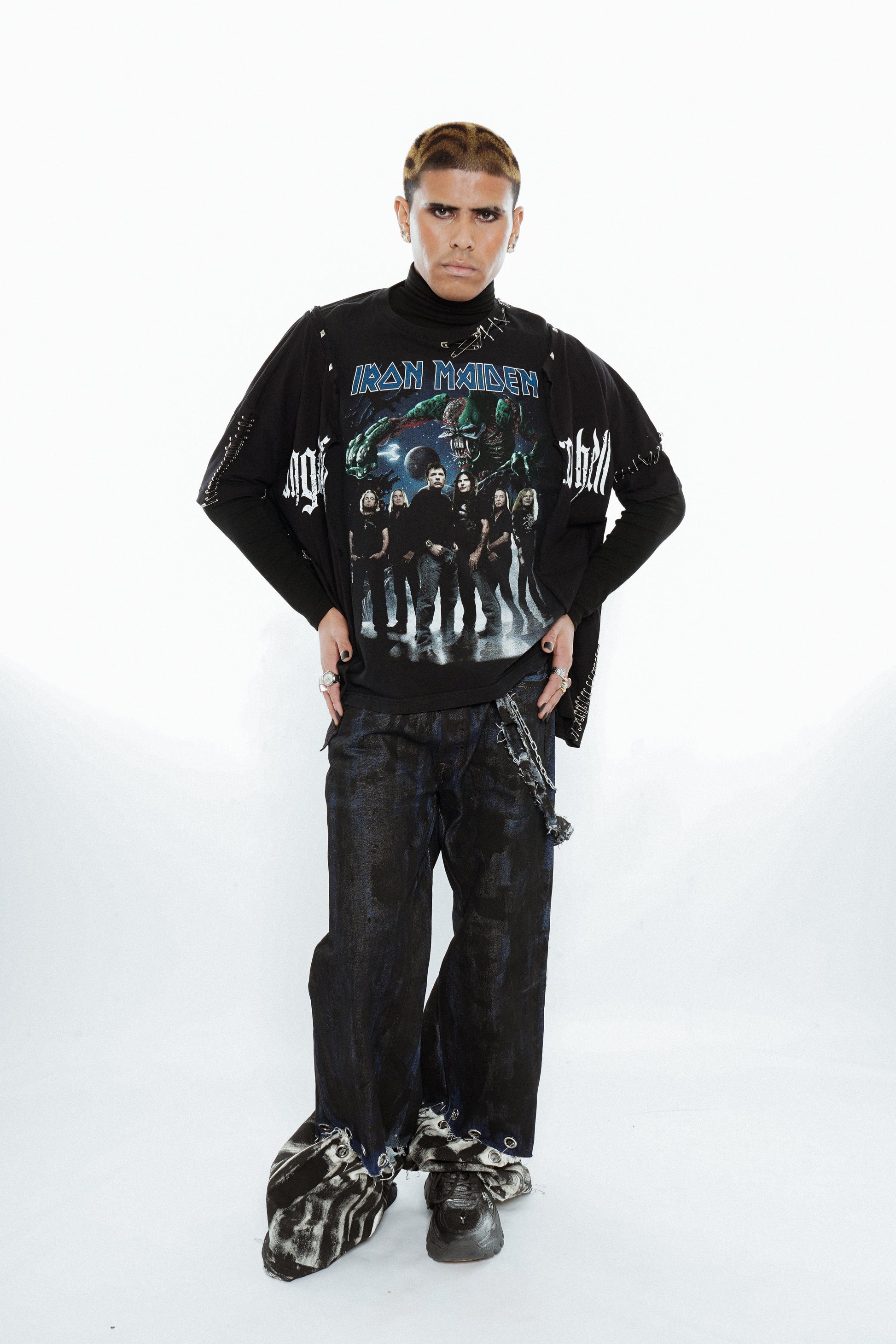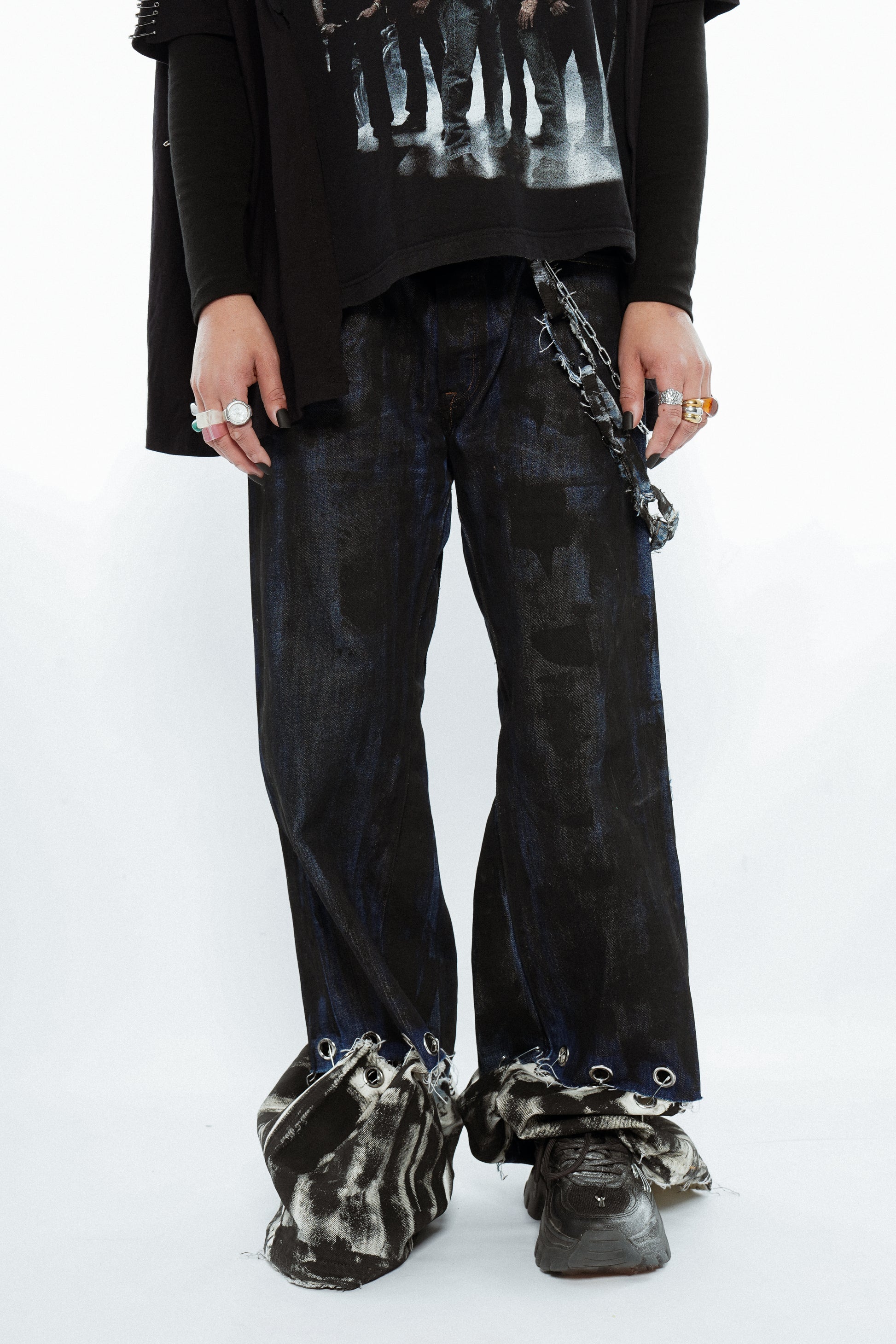 Battle-worn and built to protect. Heavy acrylic-coated denim with armour-inspired hems and raw hardware details.
