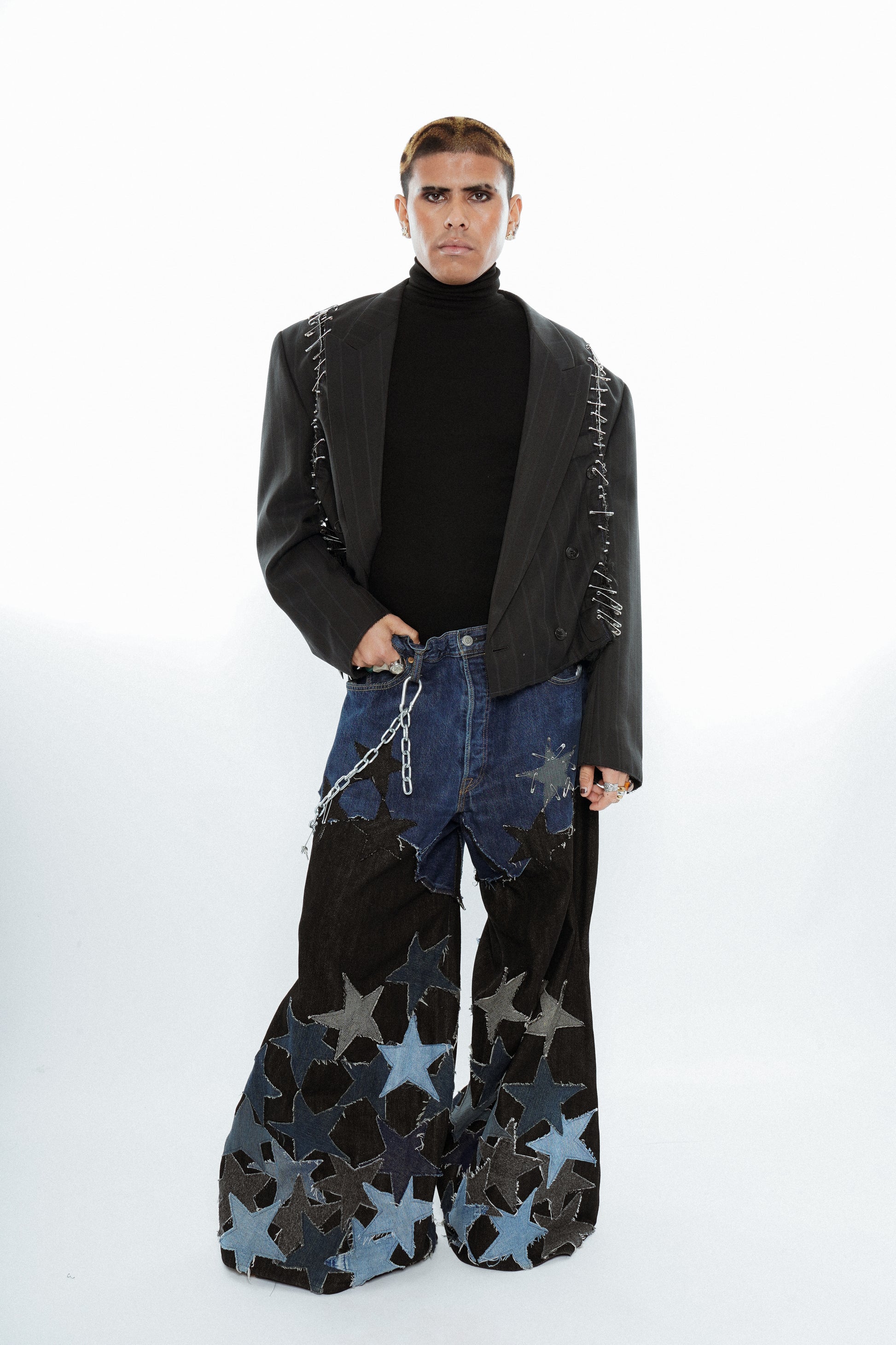 Built like armour. Heavy by design. The Guardian Star Patch Wide Leg Jeans are constructed from upcycled denim and reinforced with an extensive, hand-stitched star patchwork pattern that covers the legs in layered protection. Each star is individually cut and applied, exposing raw edges, visible seams and the labour behind the piece.