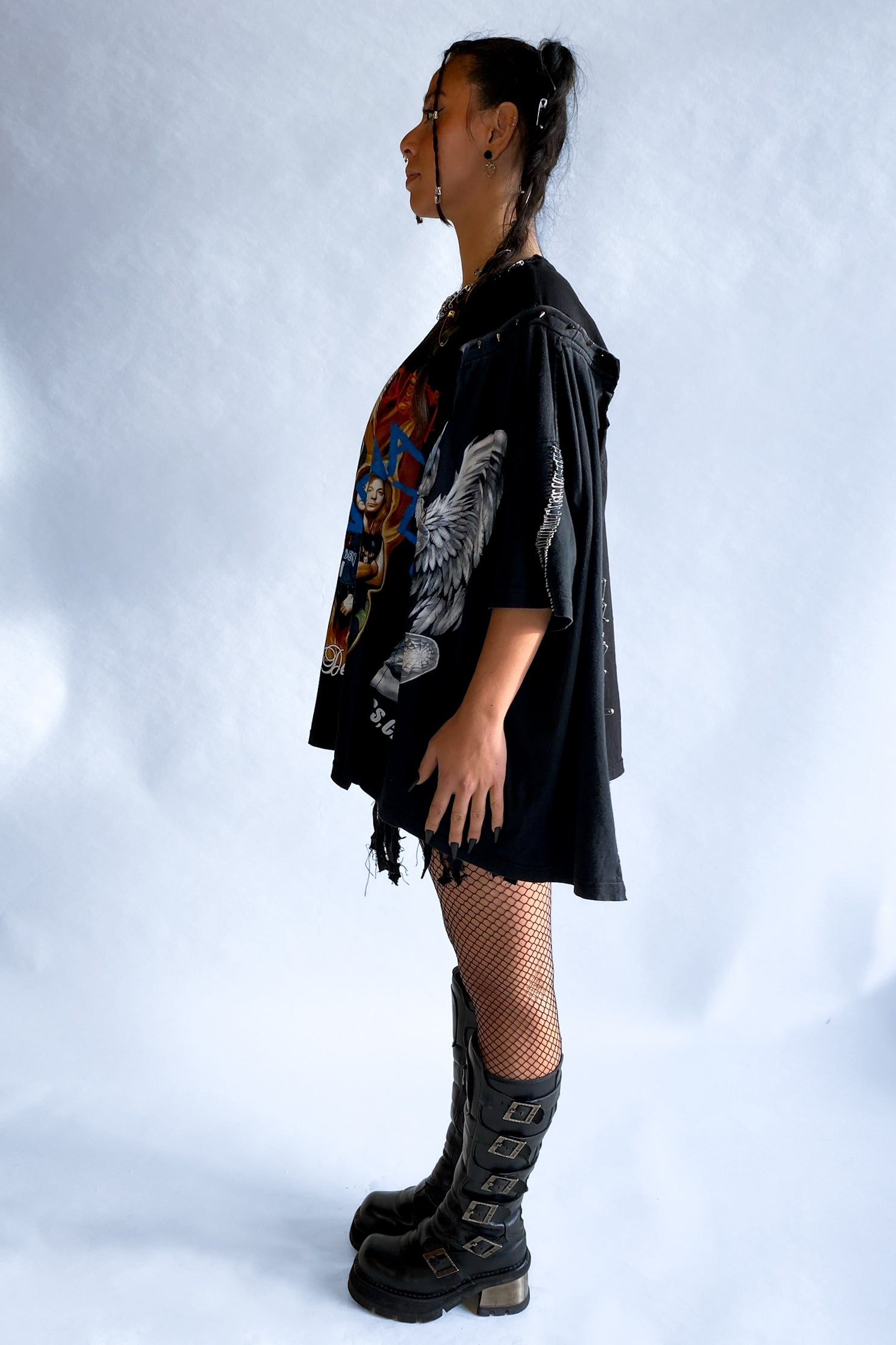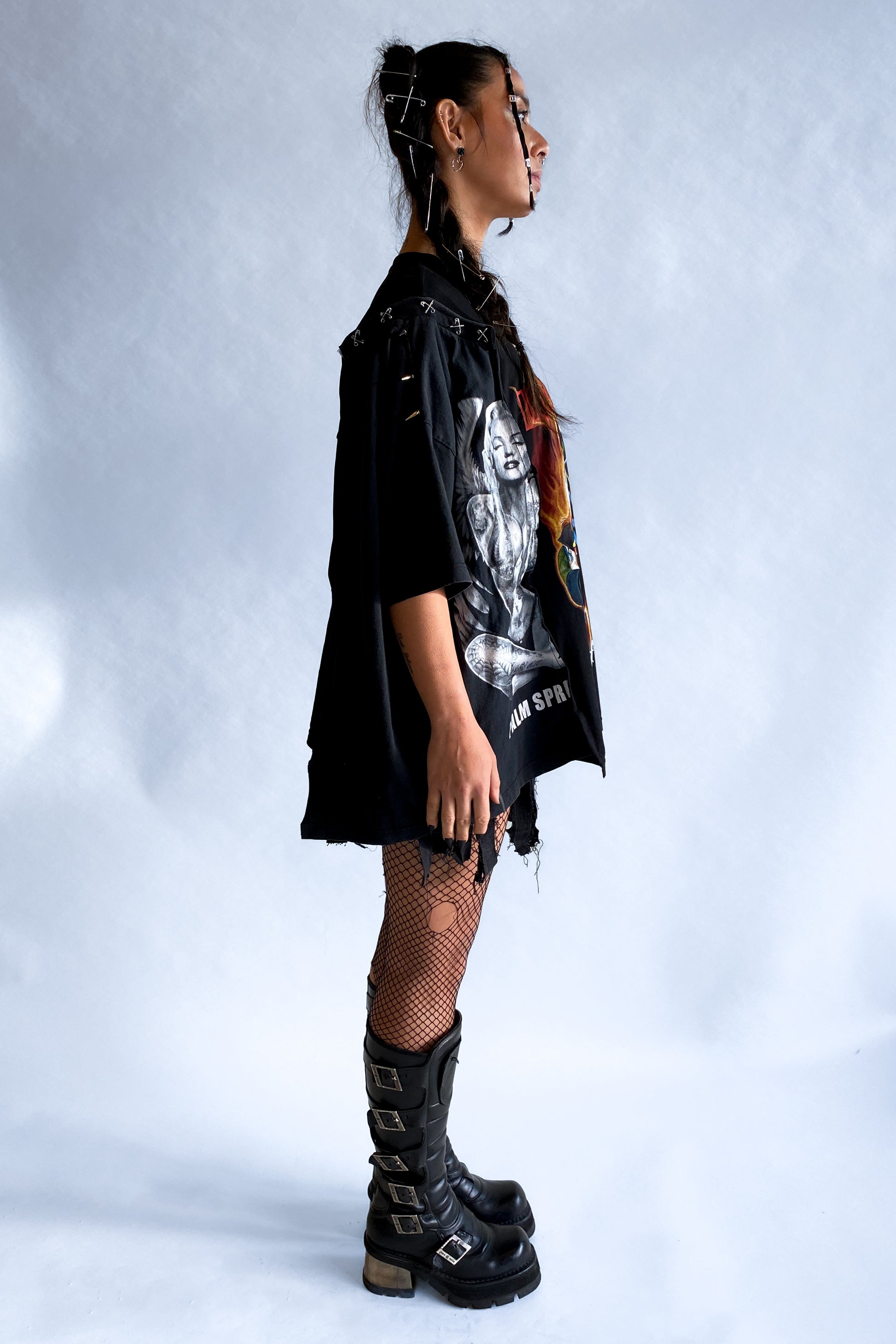 Step up your fashion game with our Imperfect Tee Upcycled T-shirt—a piece designed to kill with style. This unique, hand-customized tee is the epitome of sustainability and individuality. Crafted from upcycled vintage band t-shirts, it's embellished with spikes, our signature safety pins, and hand-painted details that bring a raw, edgy aesthetic to your wardrobe. 🧷✂️❤️🔥🪡🧵♻️🖤