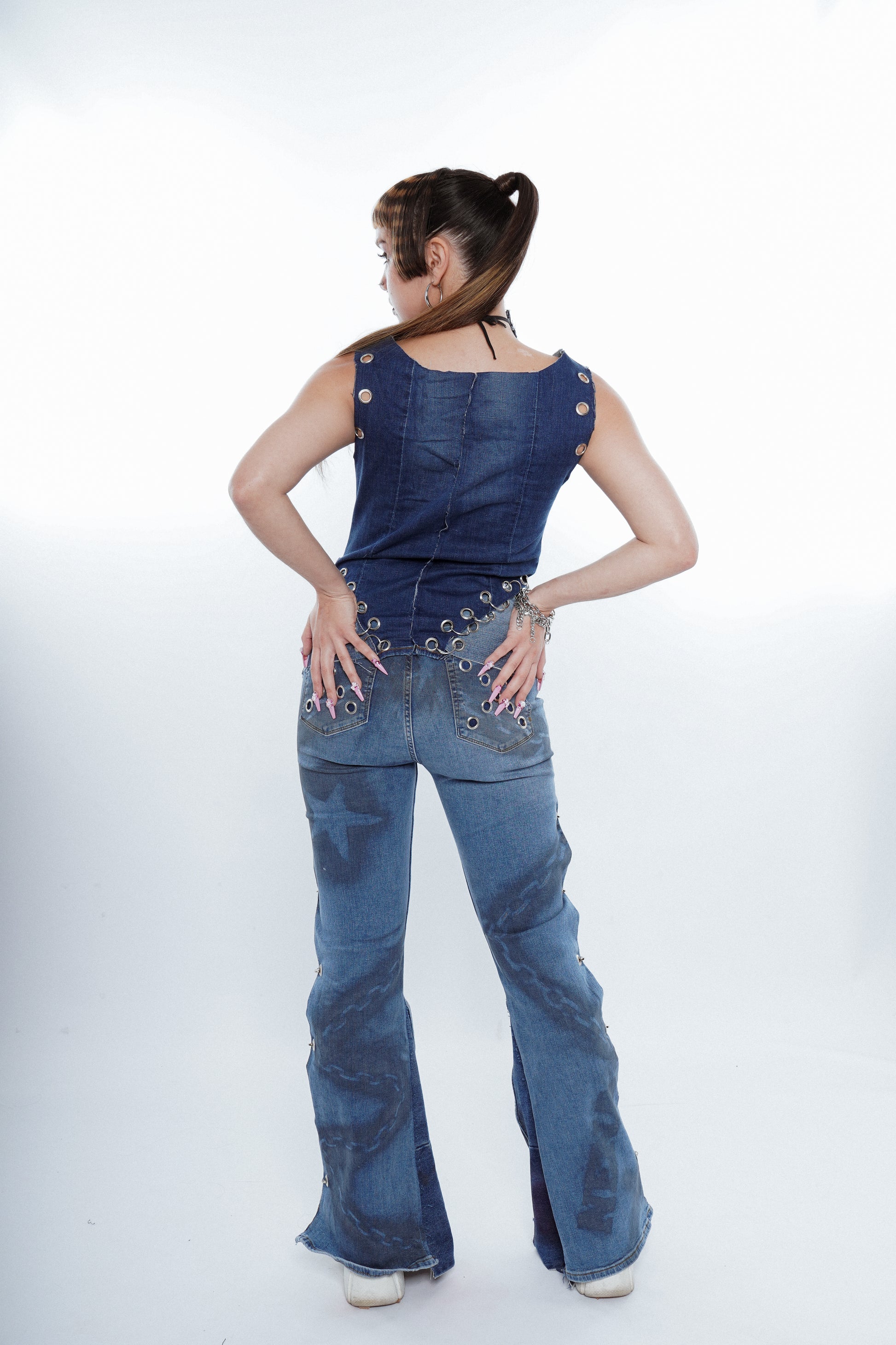 The Mirror Eyes Denim Top is a modular statement piece designed to transform in form not in size. Constructed from upcycled denim panels with a removable metal ring system, it can be worn fully laced, partially opened, or stripped back to reveal clean panel lines.