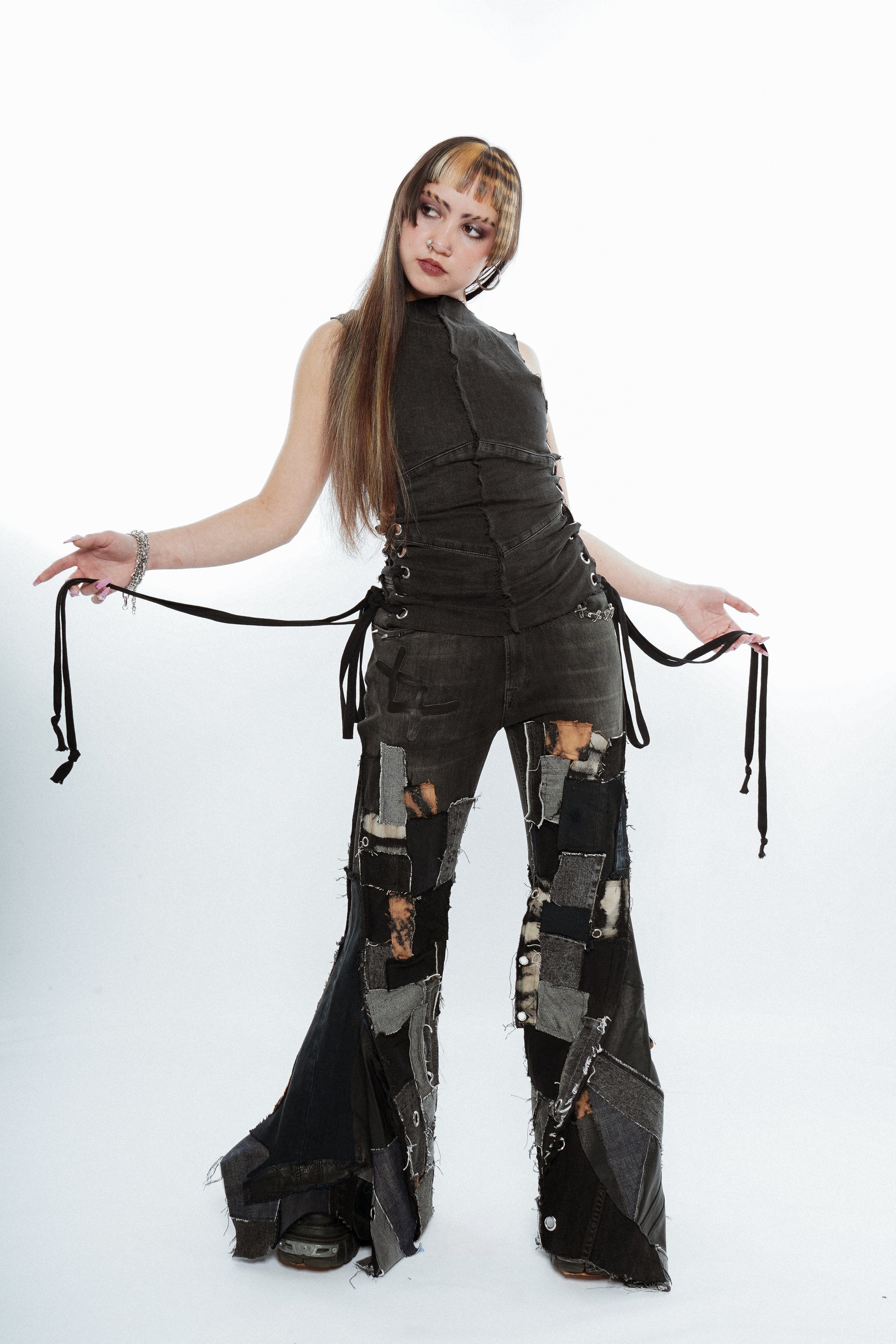 A sleeveless top crafted from stretch dark grey denim, designed with sculpted front seams to contour and accentuate the waist. Raw edges and distressed details give the piece its worn-in Guardian character. Adjustable lace-up sides allow a flexible fit while maintaining a sharp, structured silhouette.