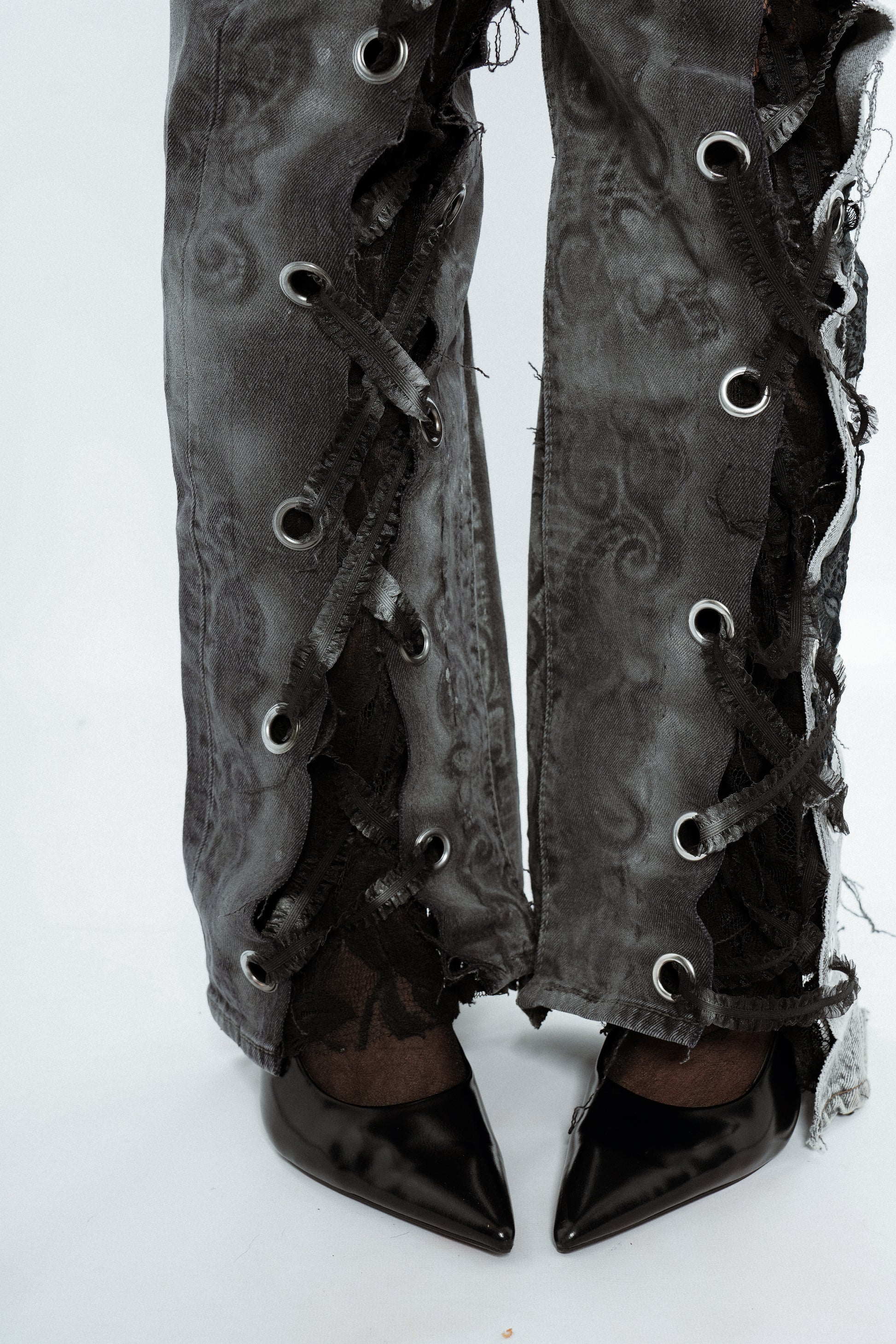 Grey washed flare jeans with distorted lace-print texture, hand-stitched lace appliqués and full side lace-up panels.