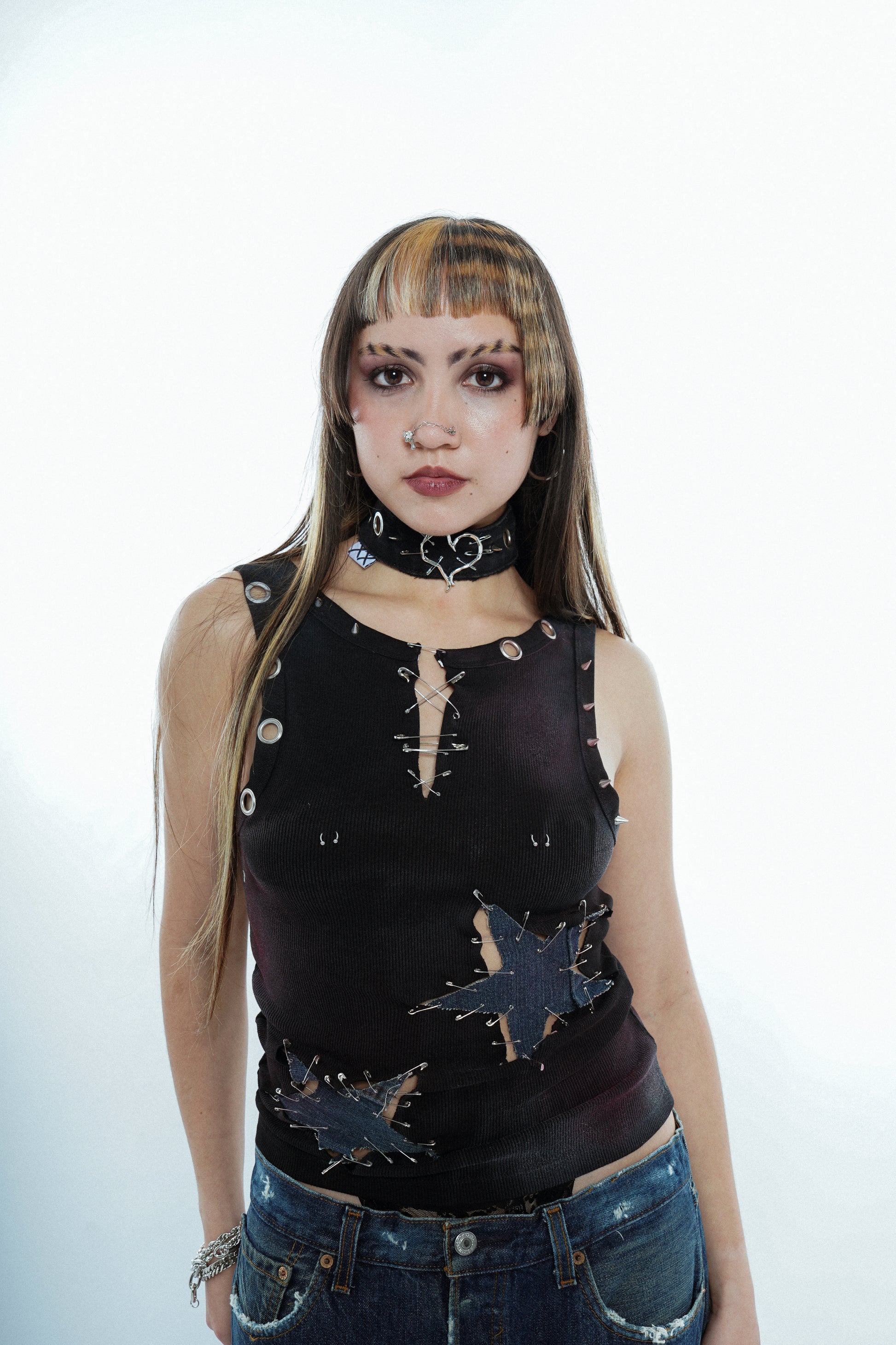 Unstable, evolving, and constantly rebuilding welcome to Morph. Sleeveless ribbed tank featuring denim star appliqués, raw cut-outs and visible safety-pin reconstruction, designed to look mid-transformation.