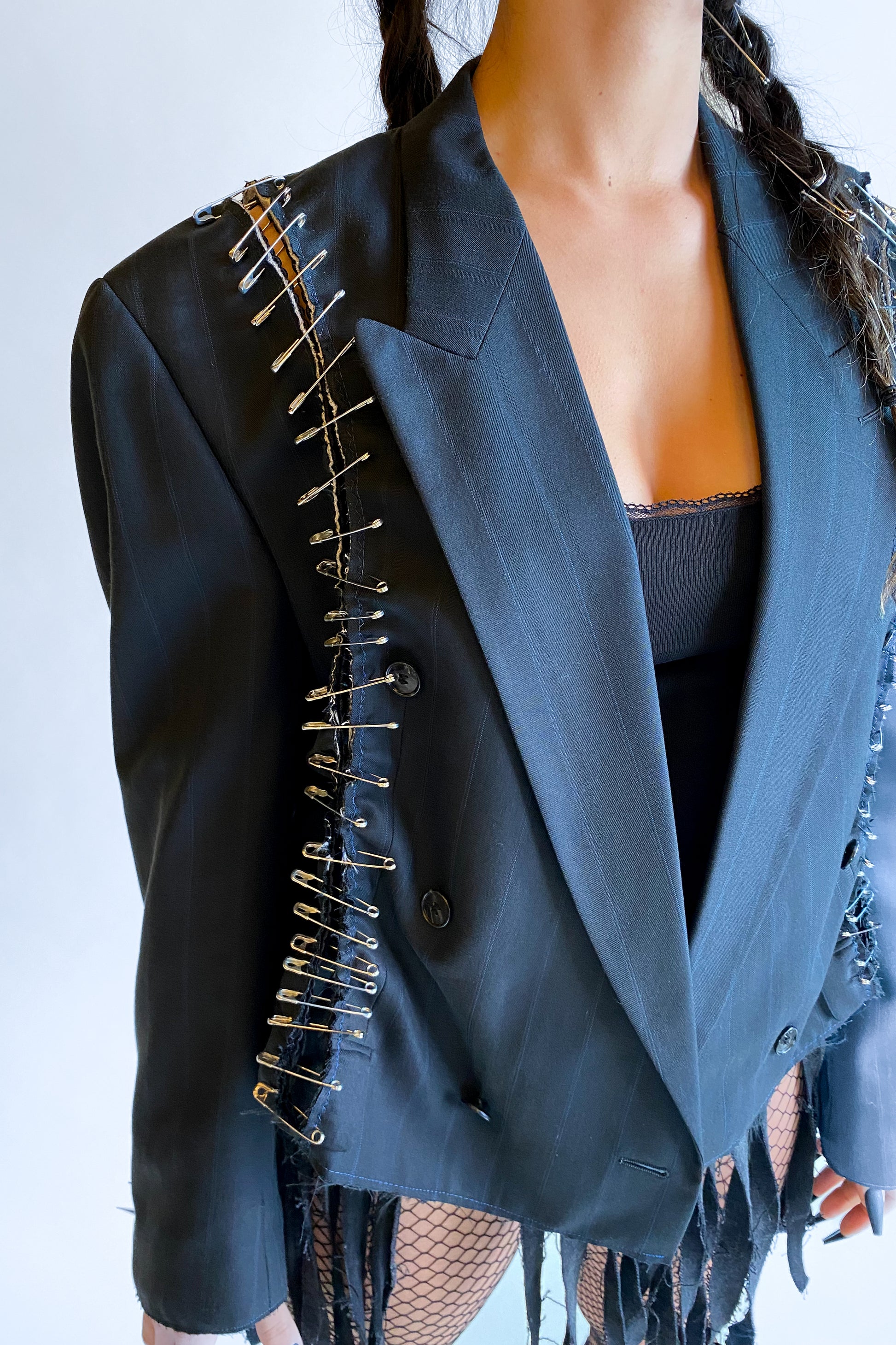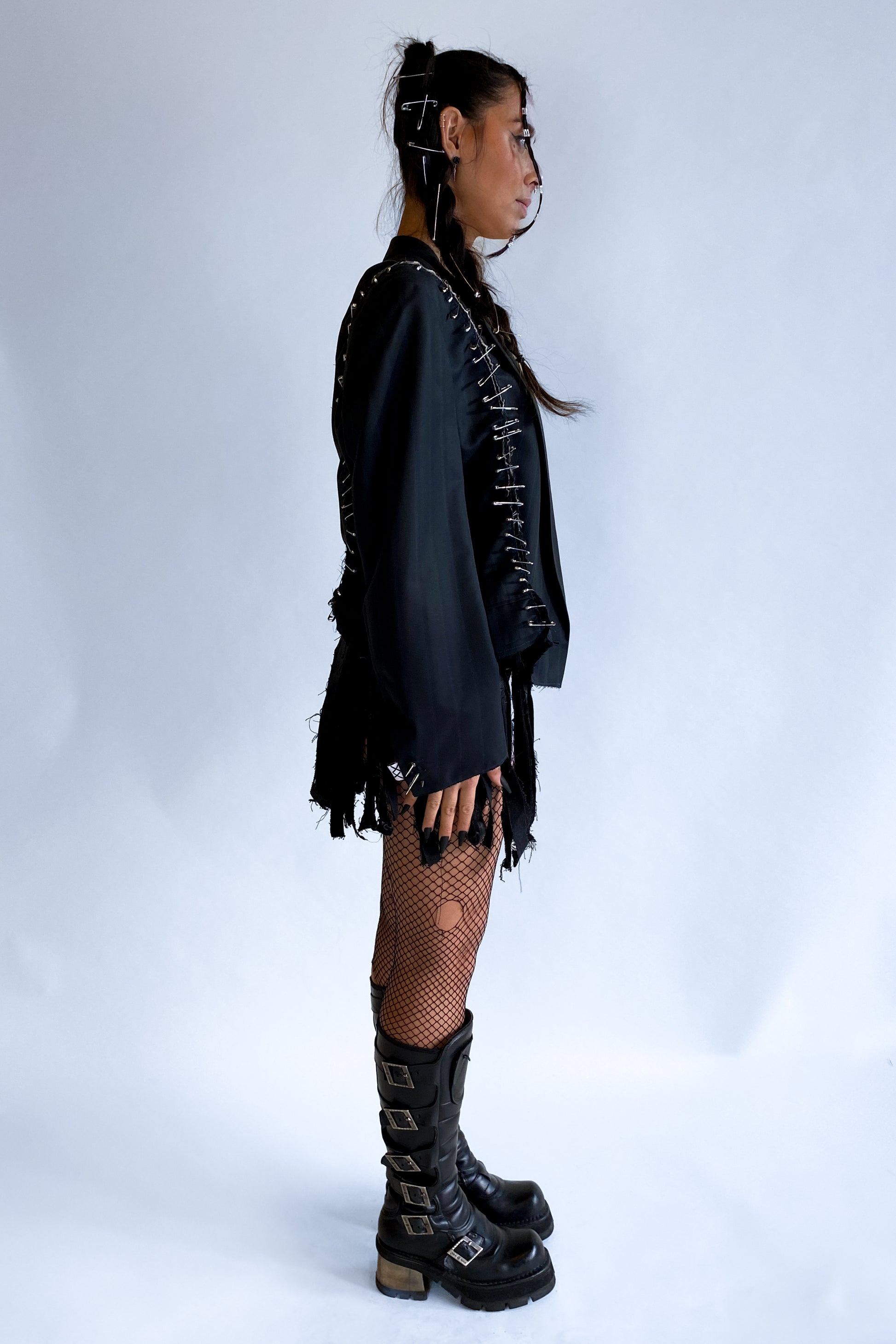 Make a statement with the "Muce" Custom Upcycled Punk Blazer—where classic tailoring meets raw, rebellious style. This blazer is carefully upcycled by splitting both sides and using safety pins to hold them together, creating an edgy, deconstructed look. The fit is square and modern, achieved by cutting off 19 cm from the bottom and stitching it with a raw edge finish, giving it a bold, unfinished aesthetic.