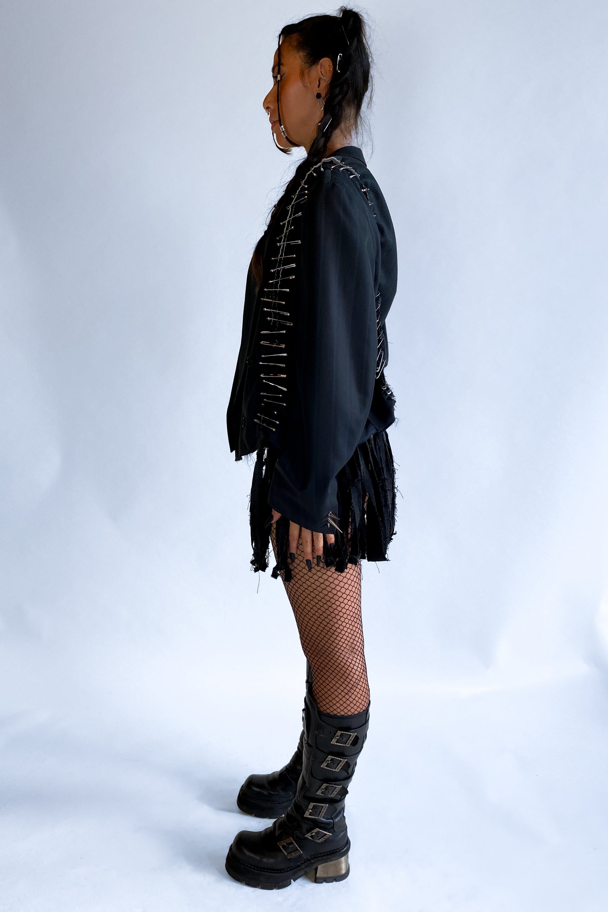- Upcycled craftsmanship: Crafted from a vintage blazer, reimagined with modern, edgy details for a sustainable statement piece.