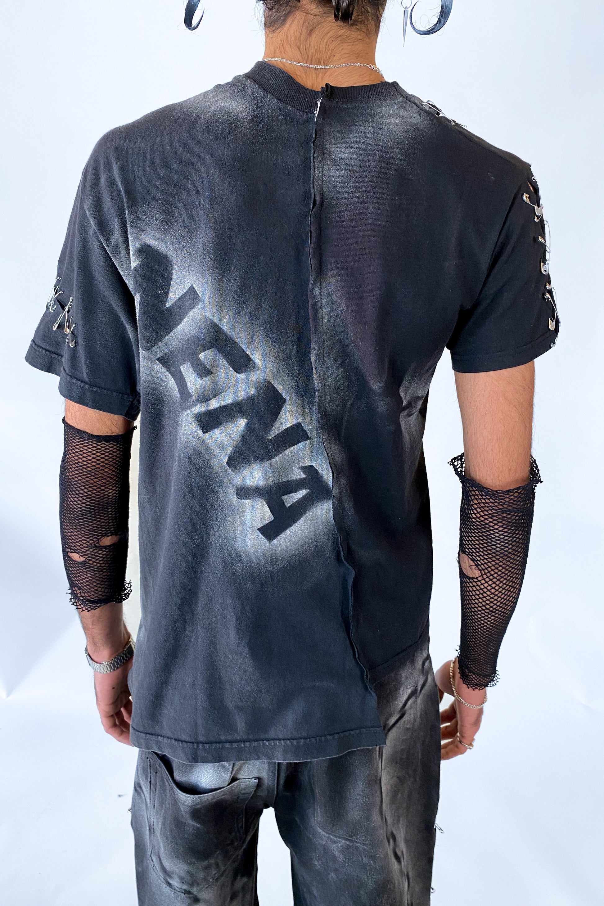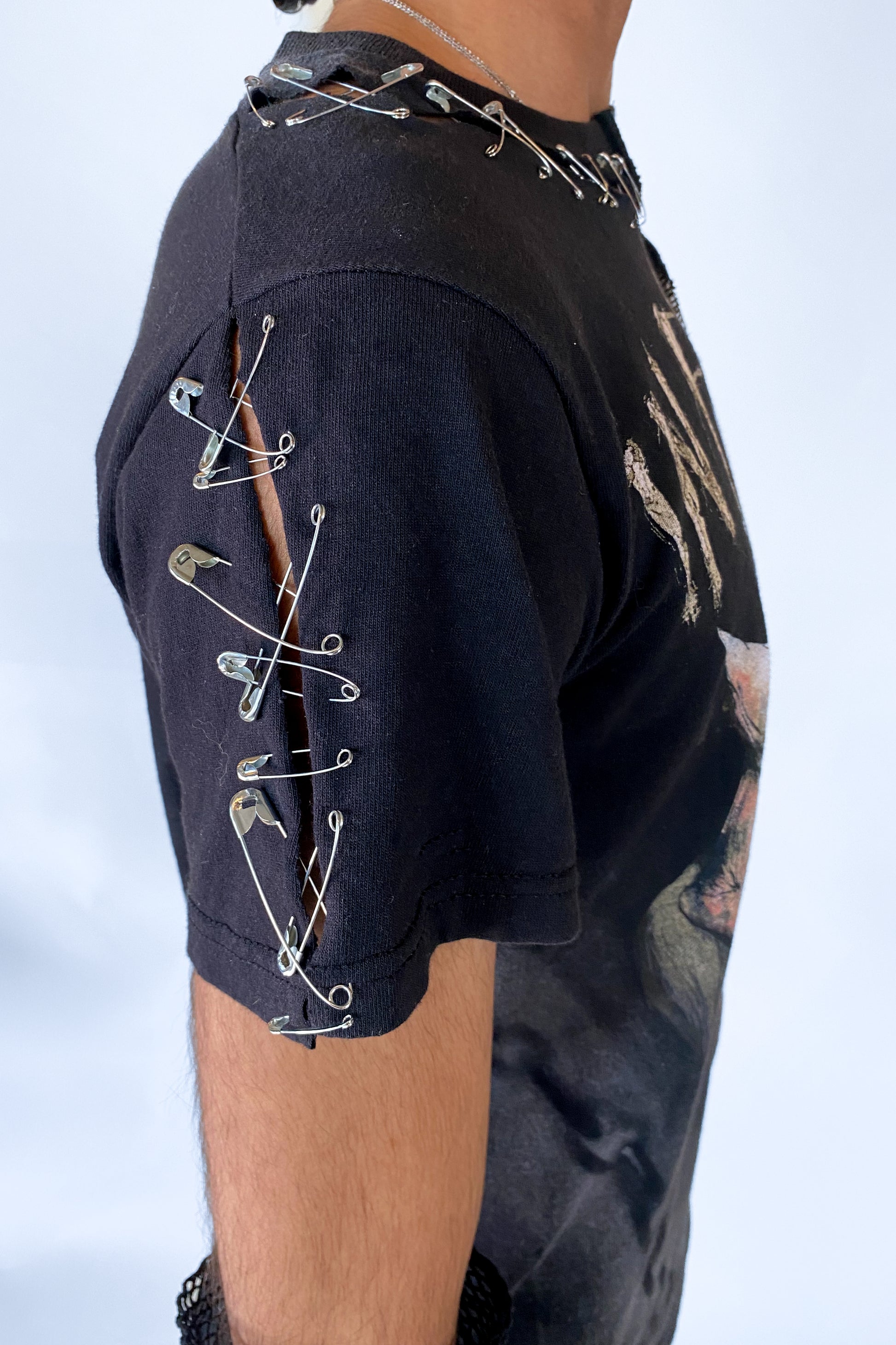 Unleash your inner rebel with the Custom Skull/Fantasy Figure Upcycled T-shirt. This daring piece is made by cutting two old t-shirts in half and sewing them together, creating an unforgettable design. One half features a striking skull print, while the other brings to life a captivating fantasy figure. This unique combo is then customized with spray paint, spikes, and safety pin details, adding layers of texture and attitude to the design.