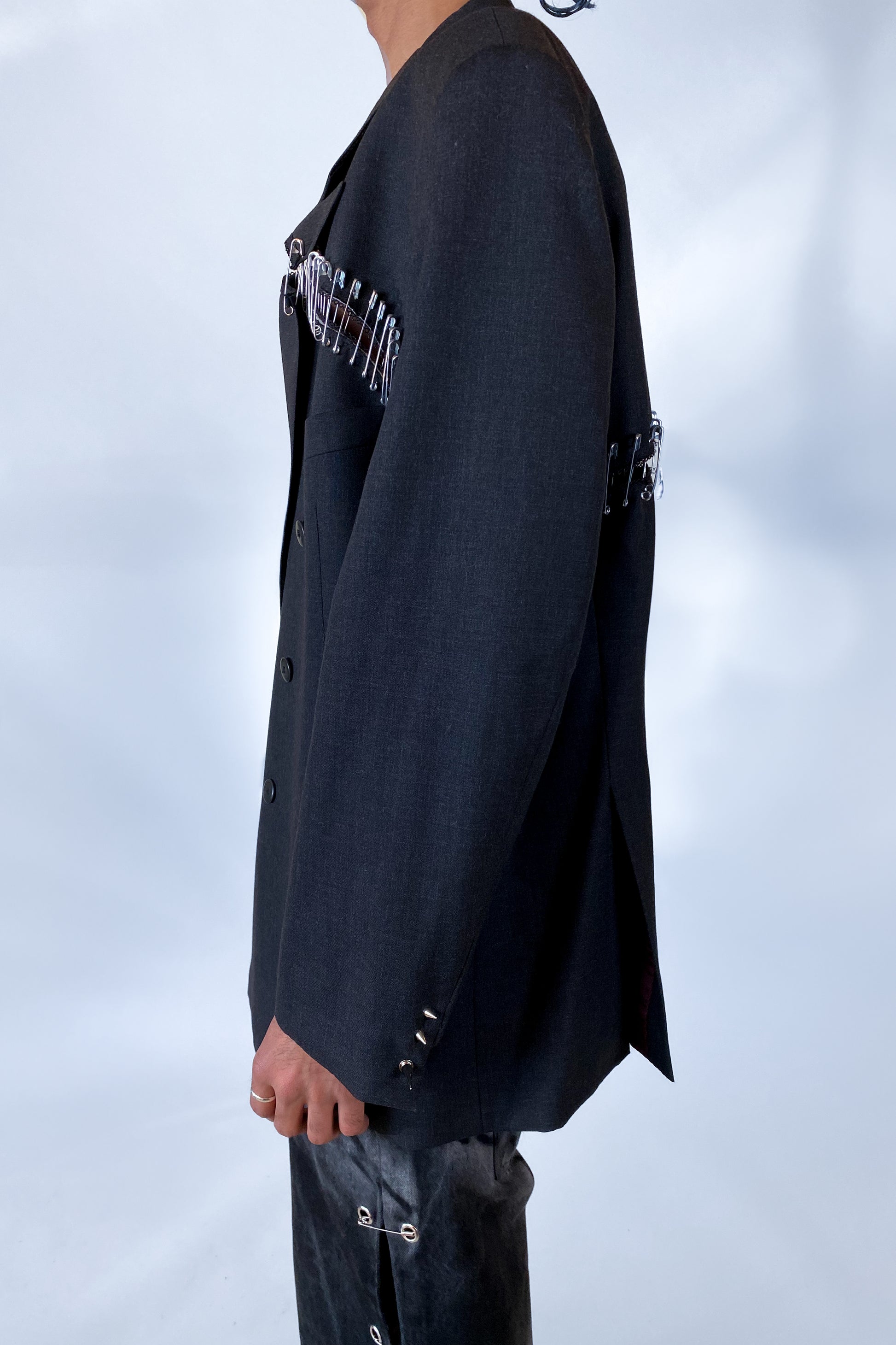 - Safety pin details: Both the back waistline and the left sleeve are reattached with safety pins, giving a punk-inspired, deconstructed edge to the blazer.