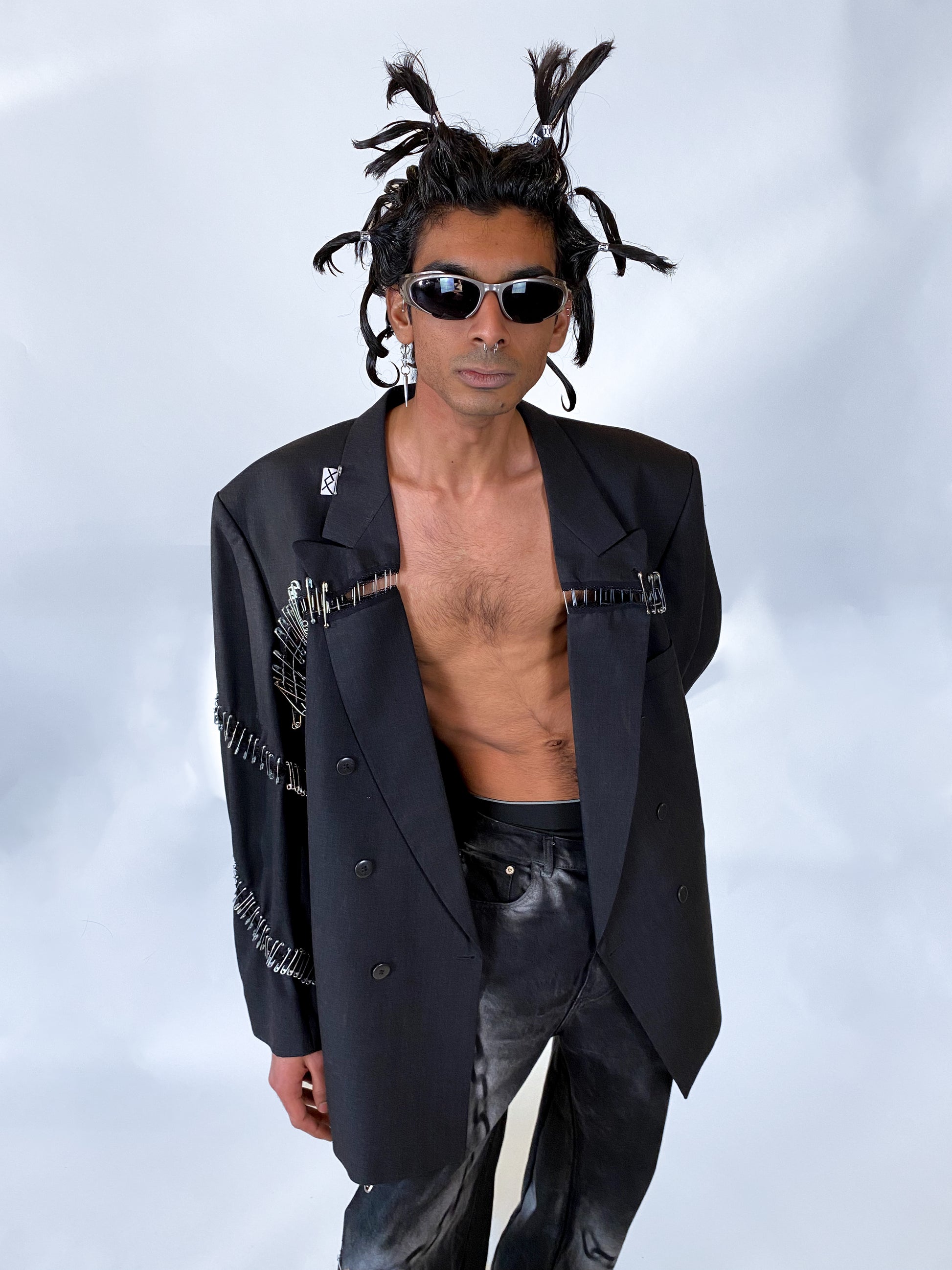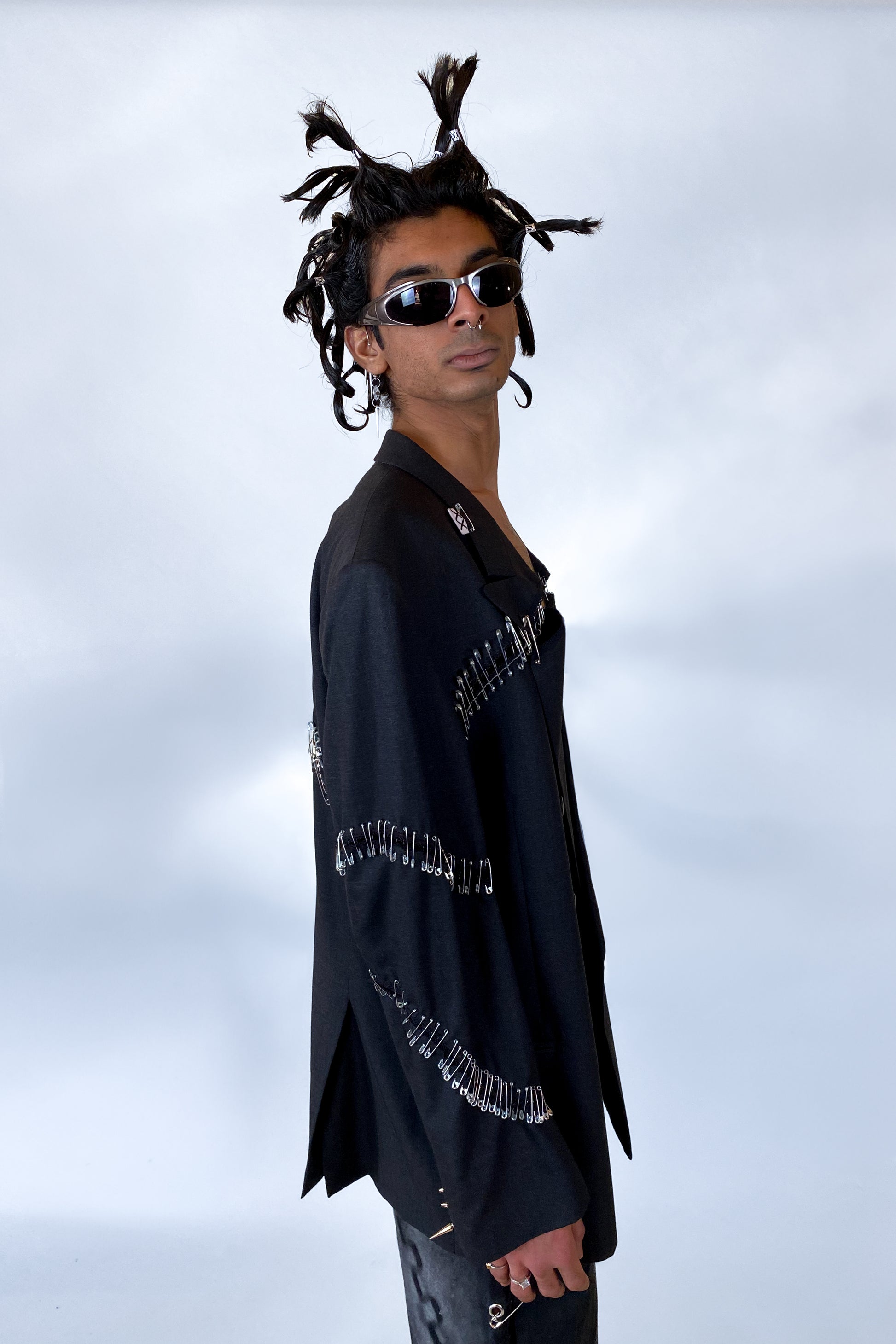 The blazer is cut in half at the back waistline, creating a dramatic, high-fashion look. The cut then extends to the front, reaching just above the chest, resulting in an optical bolero effect that plays with proportions and structure. The two pieces are reattached using safety pins, adding a DIY, punk-inspired twist to the design.