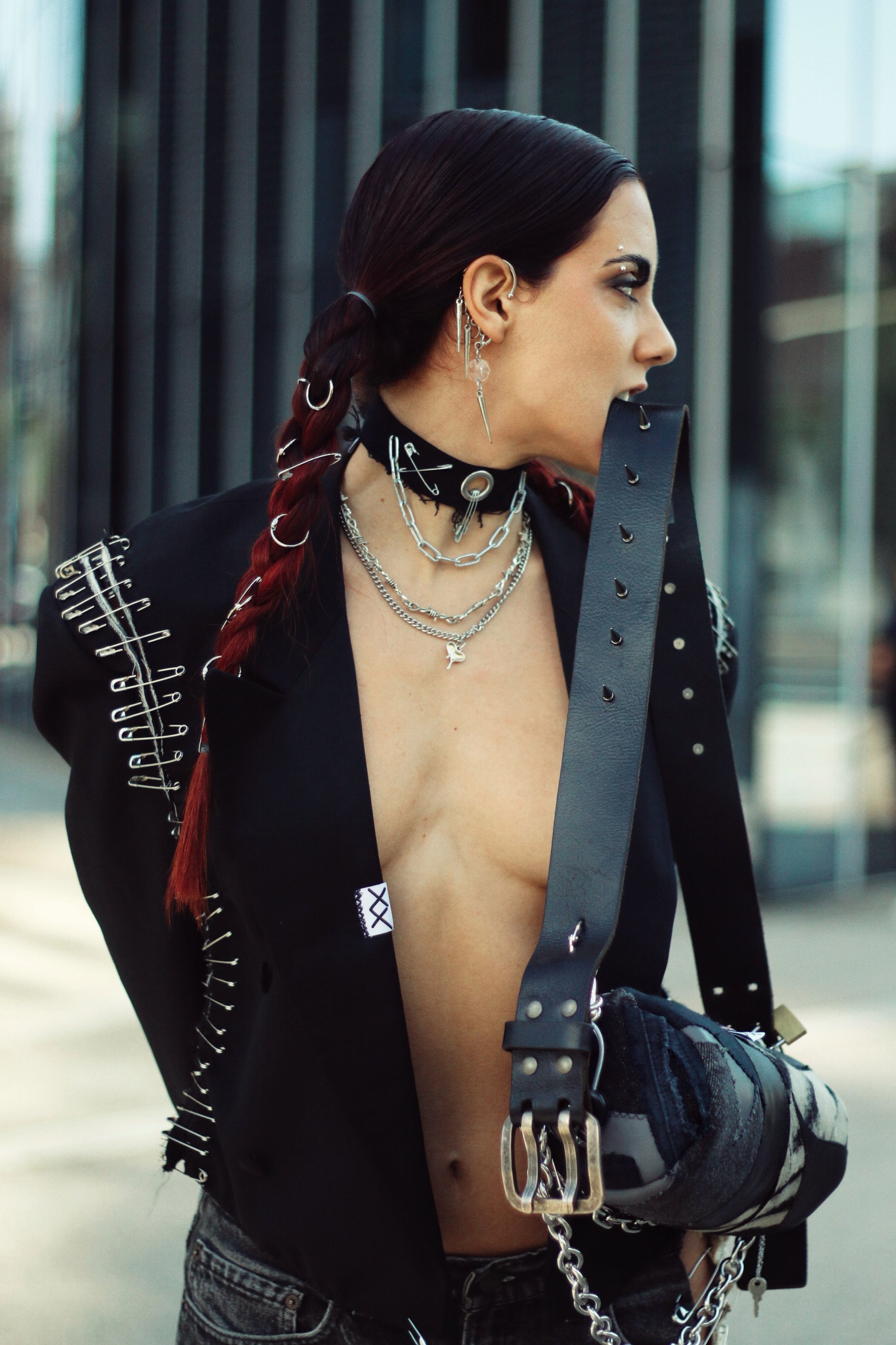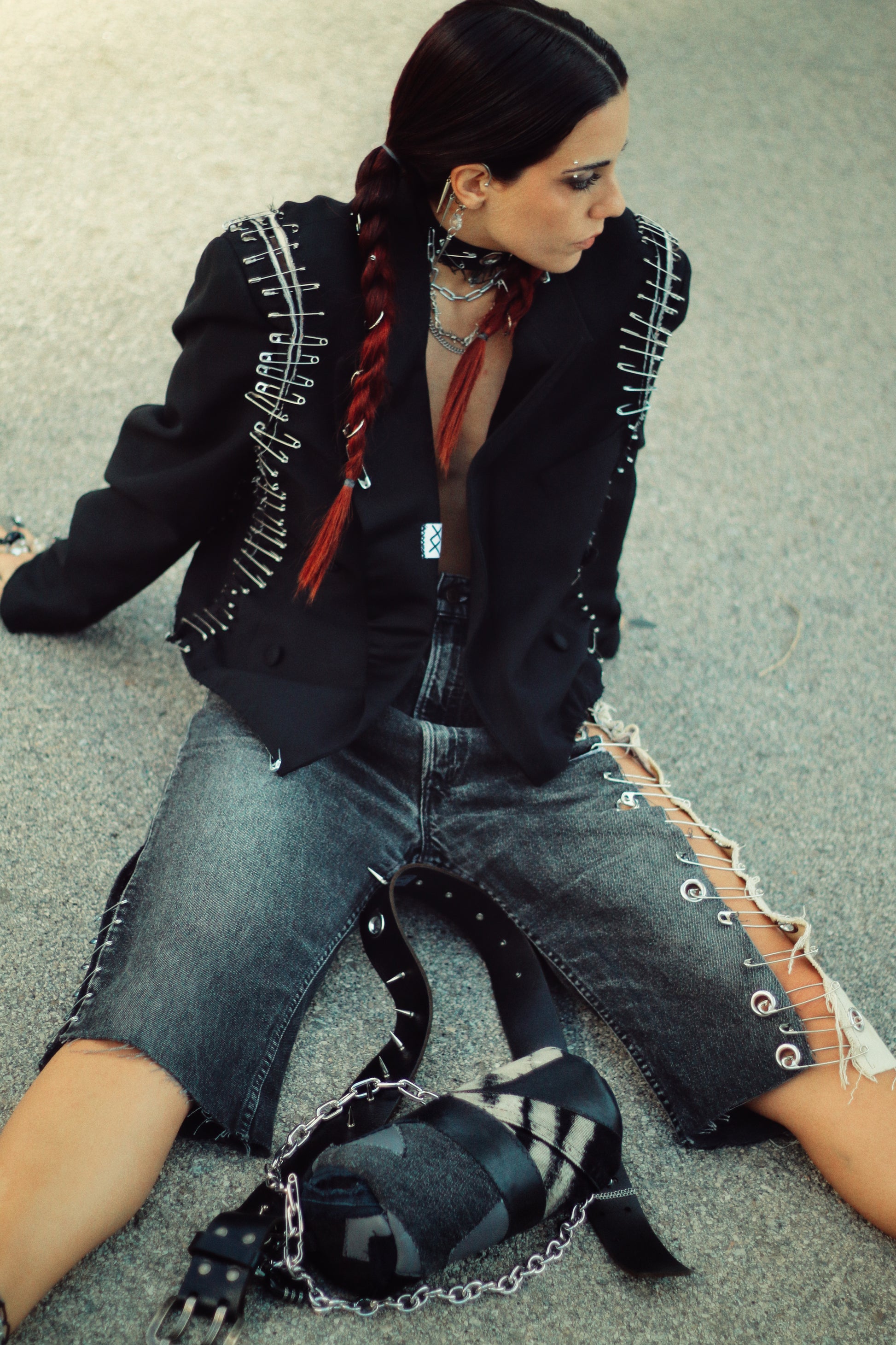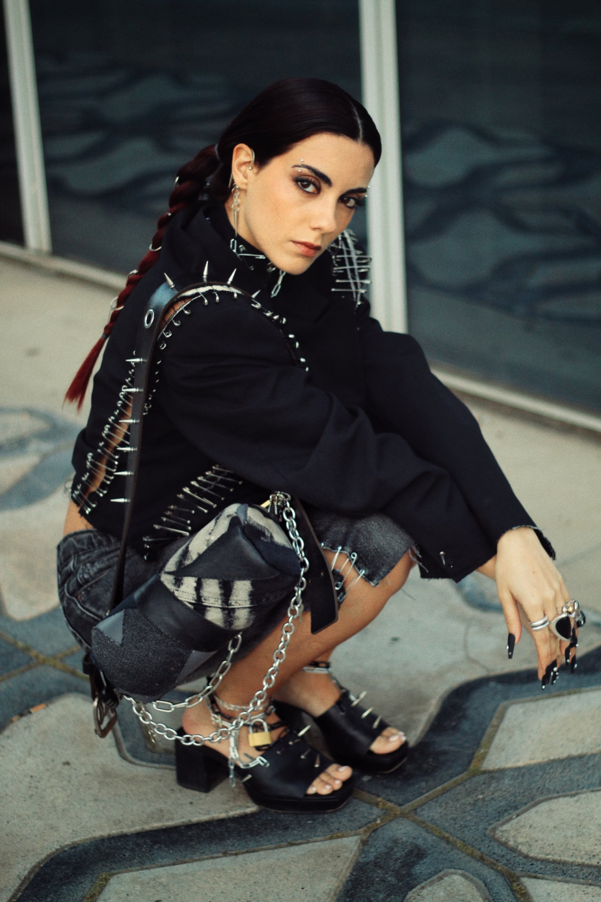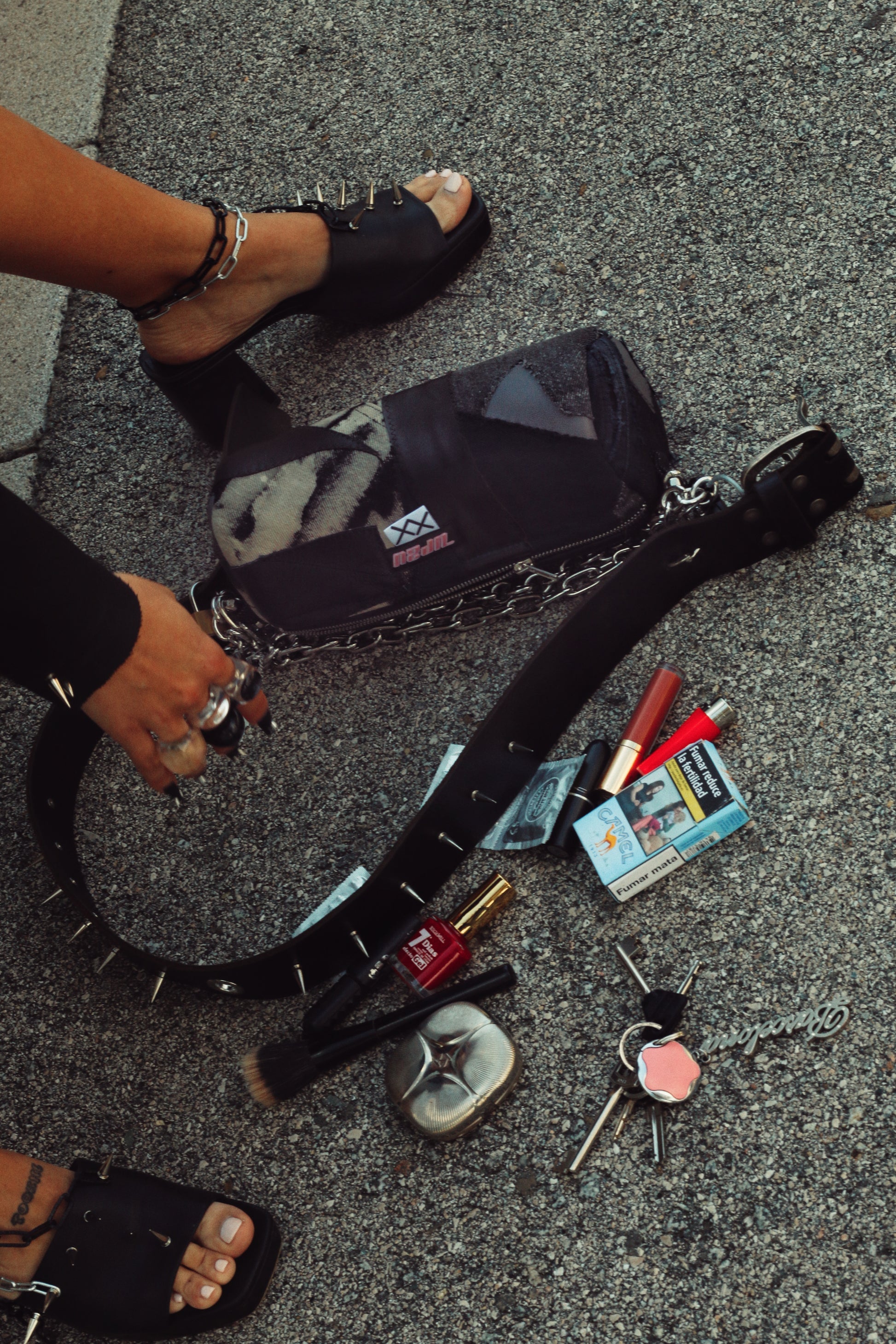 Leather and Denim patchwork fabric made from carefully selected left over destroyed denim and leather. The crossbody strap is made from a vintage leather belt, decorated with spikes. The chains are embellished with safety pins and locks. 🔒 🧷⛓️👖