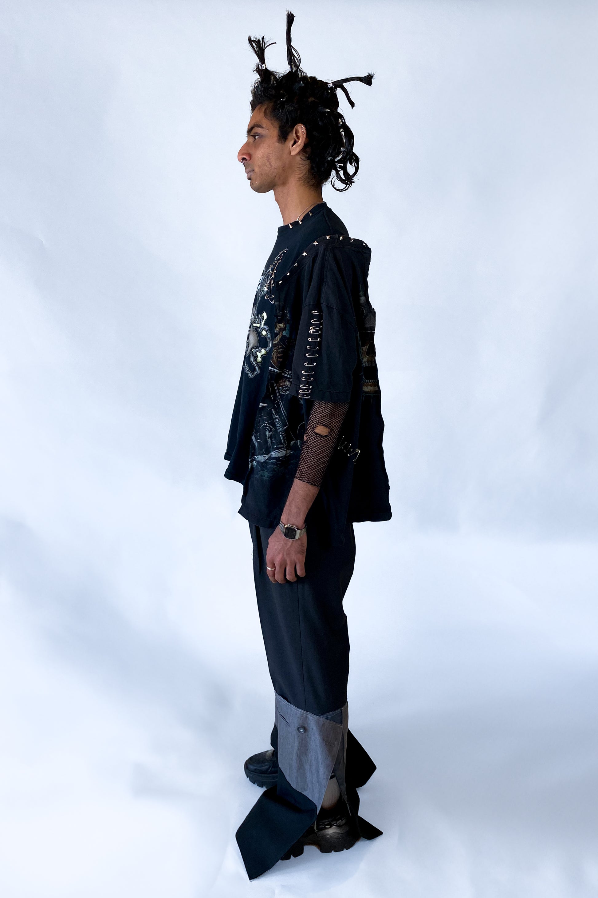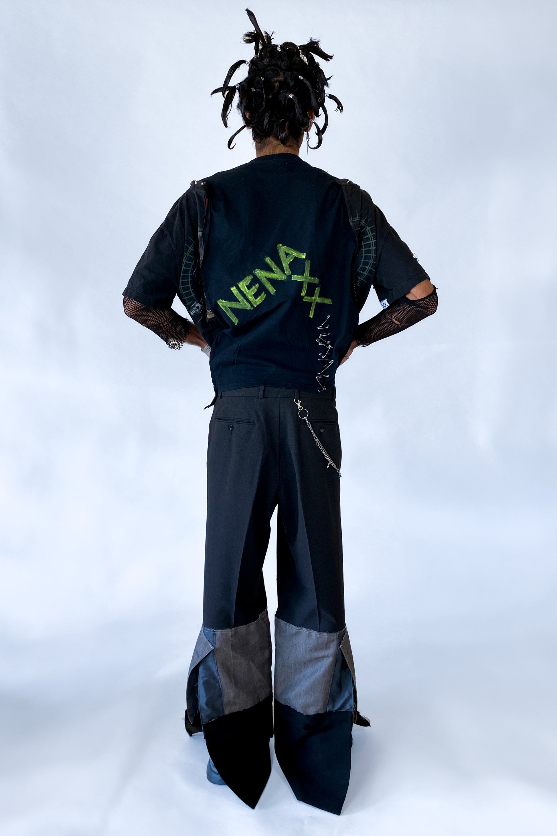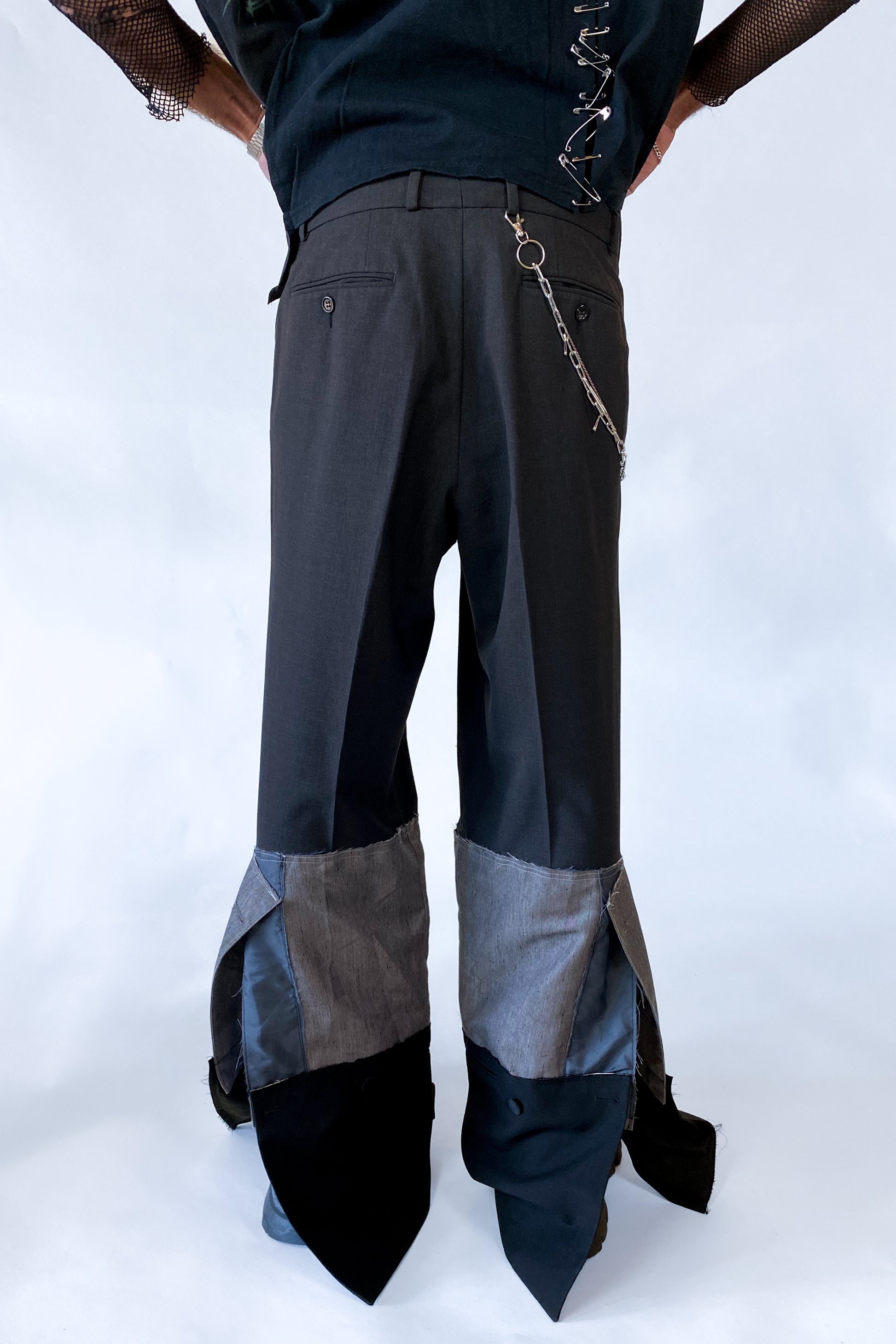 The “Chain Gang” Upcycled Wide Leg Pantalon is a true standout piece that merges vintage, punk, and custom design into one bold statement. Crafted from the bottom parts of old blazers in grey and black, these pants are given a fresh, deconstructed look with wide leg proportions. The black pantalon base offers a sleek foundation, while the added elements take it to a whole new level of punk-inspired rebellion.