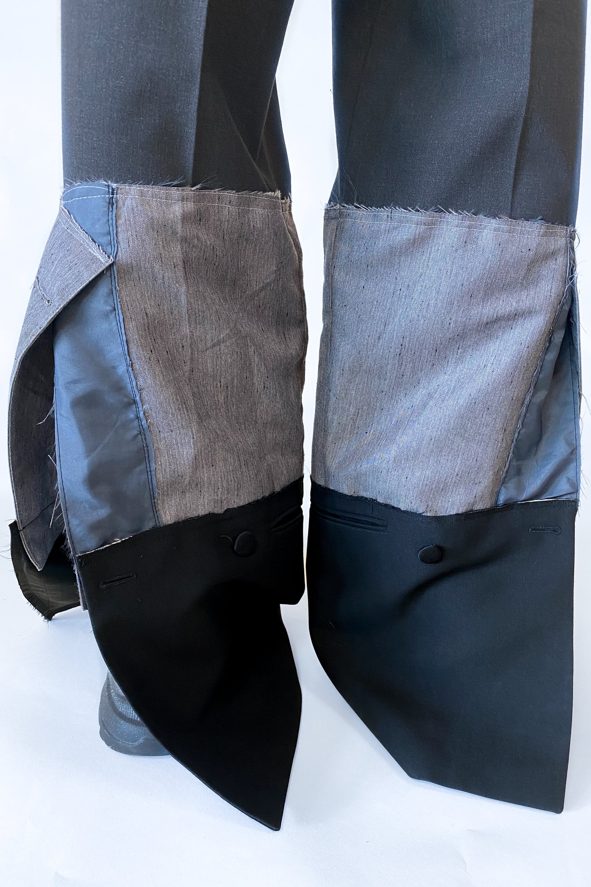 - Upcycled design: Constructed from the bottom parts of old blazers, combining grey and black for a unique wide-leg silhouette.