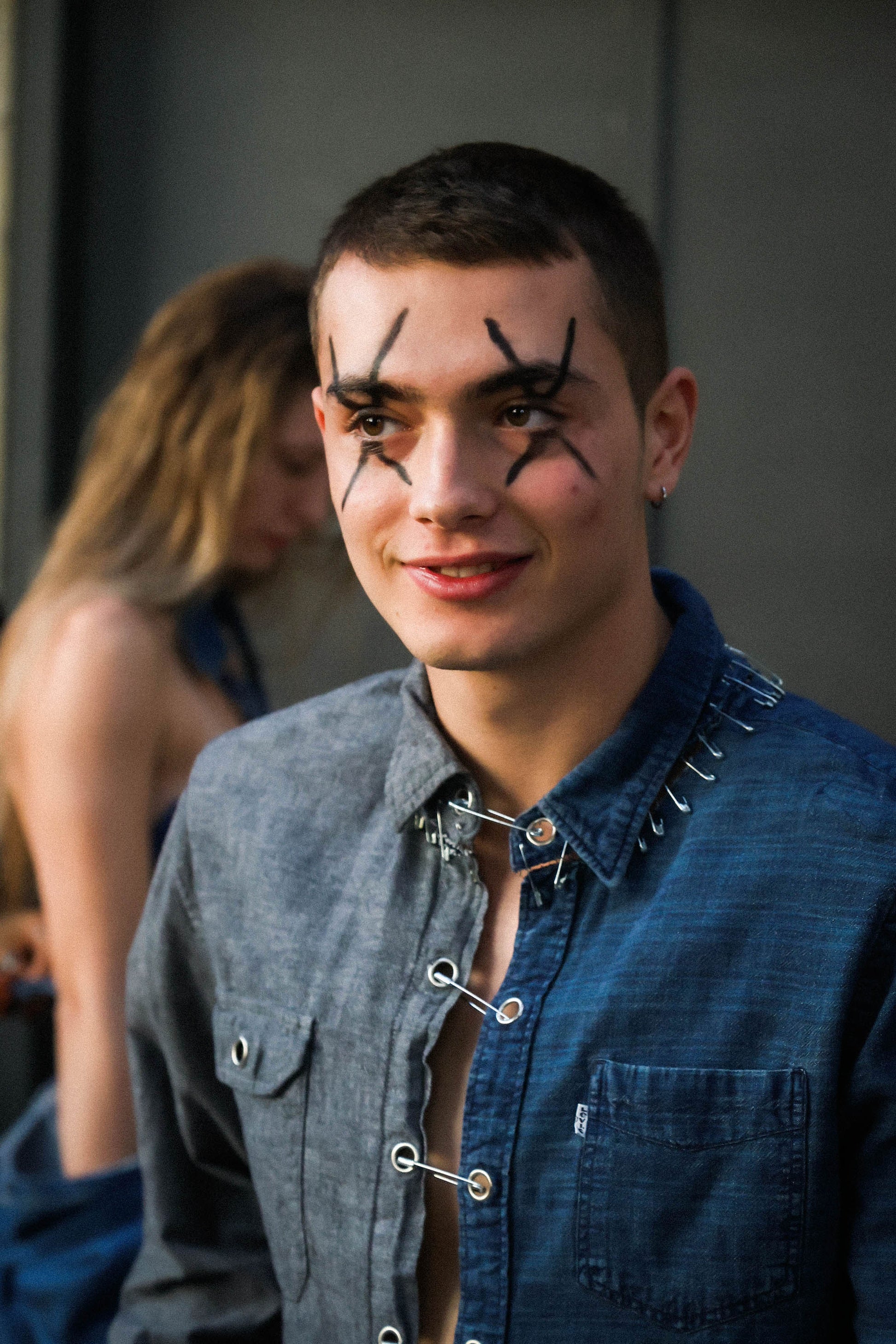 Meet SPLIT our upcycled denim shirt. We combined 2 denim shirts and stitched the back parts together. In front we replaced the buttons for an eyelet/safetypin closure. We also opened up the neck opening en added safetypins to create an edgy look.