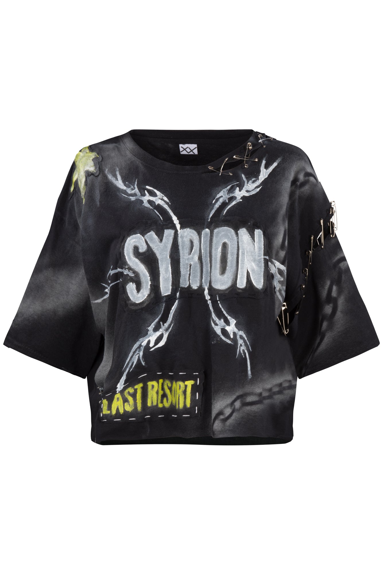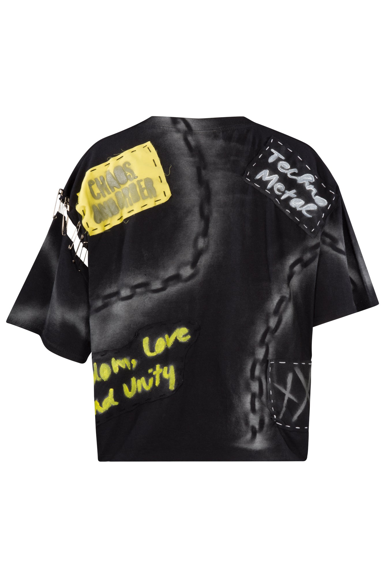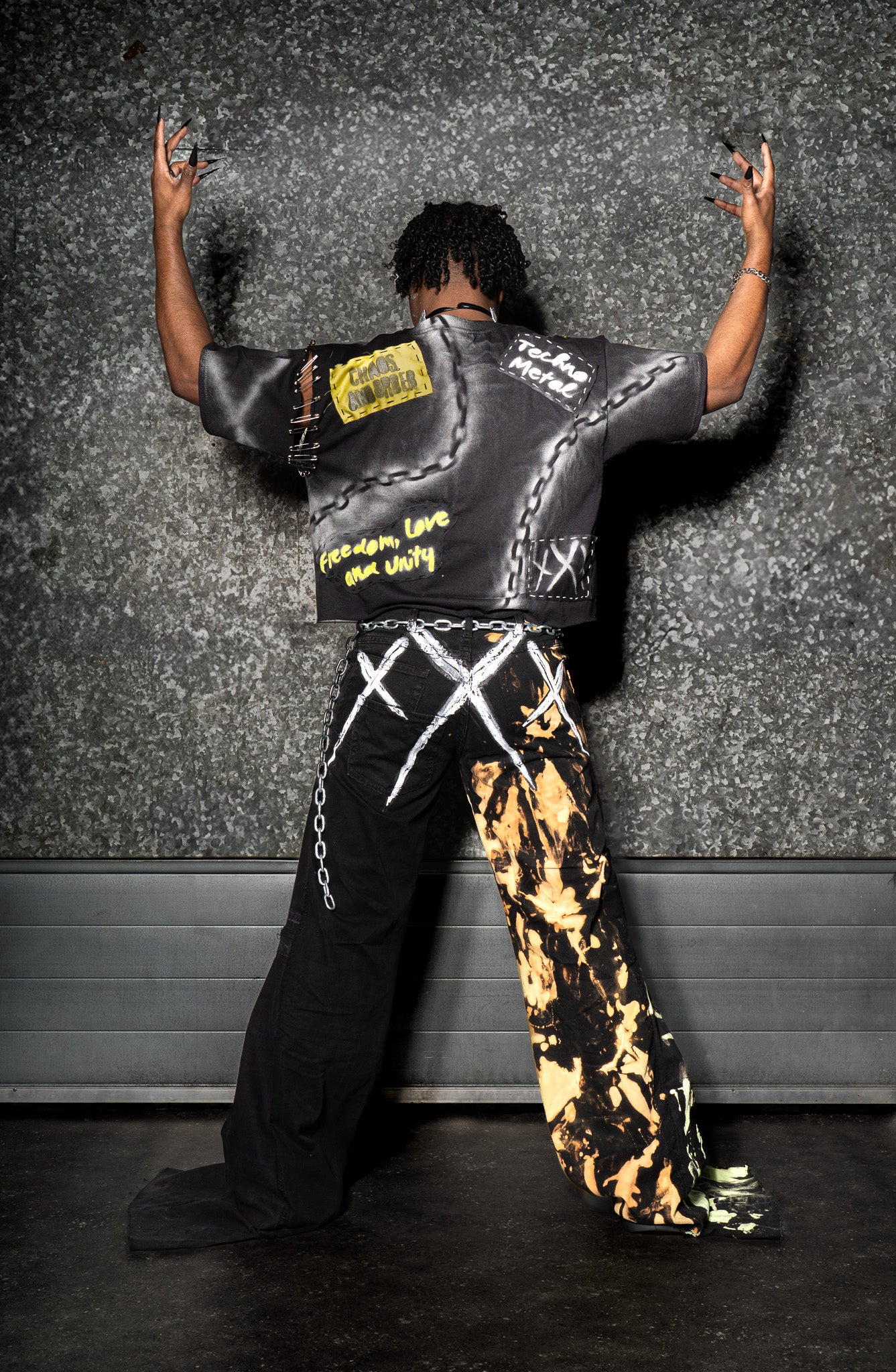 Designed for those who dare to stand out, the tee features carefully placed cuts with safety pin details, all hand-sewn for that authentic DIY look. Hand-painted patches and spray paint accents add layers of individuality, making every piece a one-of-a-kind creation. It's not just a tee—it's a canvas for rebellion, ready to disrupt the status quo.