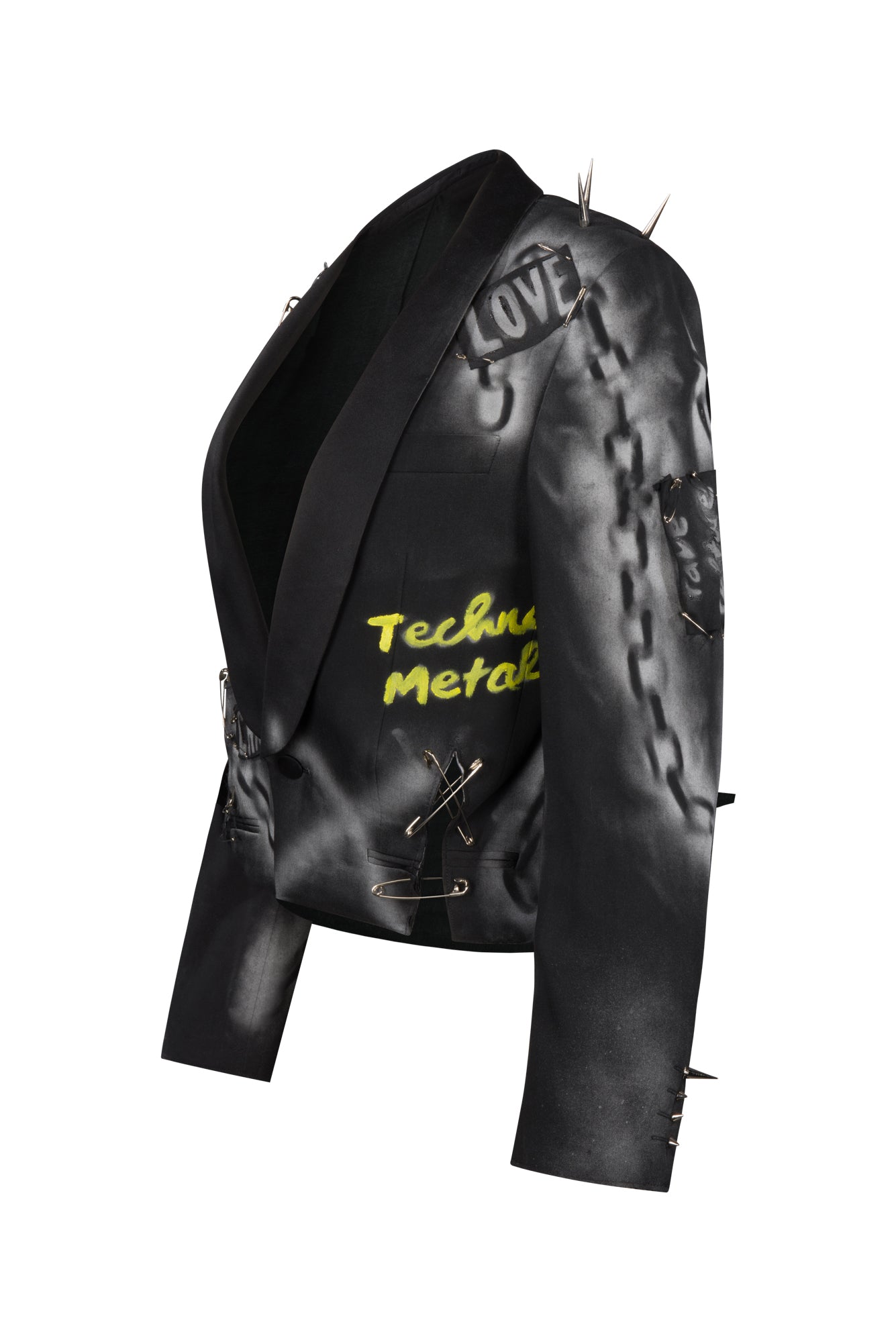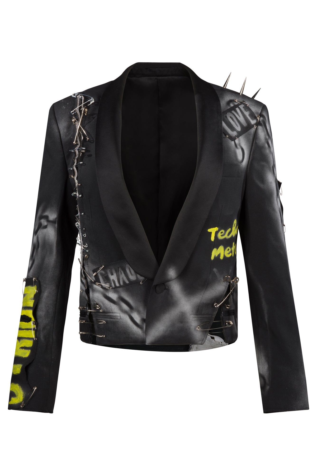 Safety pin + spike hardware: The blazer is split and reattached with silver safety pins and adorned with large, brutalist spikes for a tactile punk punch.