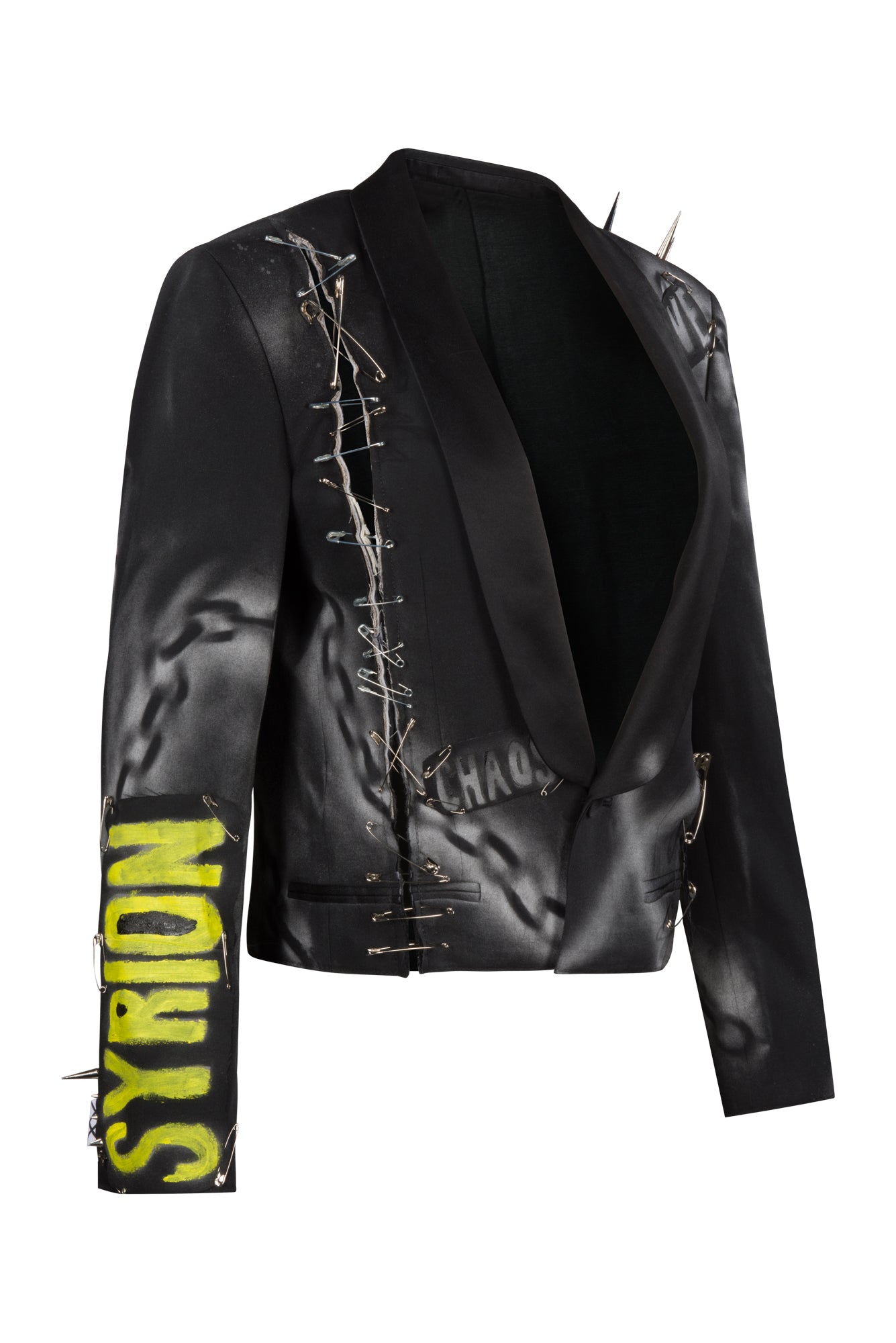 Every element of the blazer reflects the rhythm of rebellion. Upcycled from deadstock and vintage tailoring, the piece is slashed, spiked, and reassembled with an aggressive punk aesthetic. Raw edges, exposed seams, and torn symmetry speak of destruction and rebirth, while spray-painted strokes and hand-painted patches inject a chaotic, one-of-one energy.