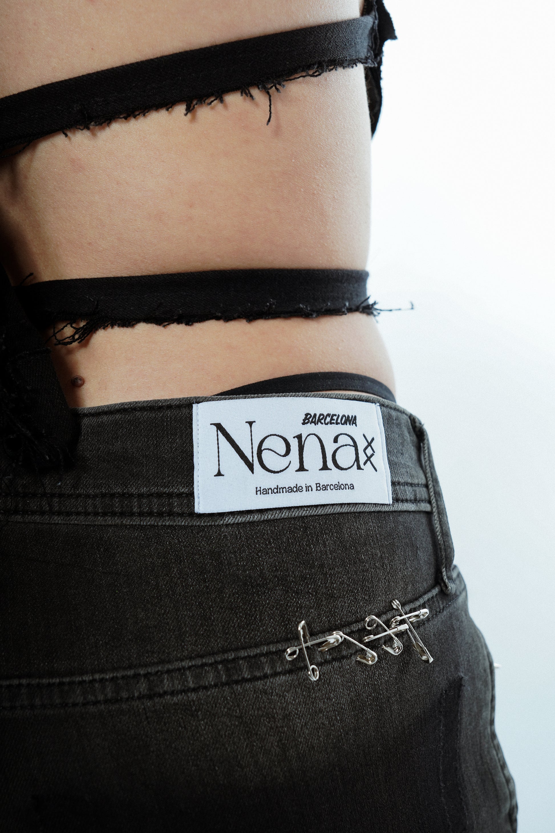 The Morph Cross Denim Top is constructed from black denim, shaped into a sculptural cross silhouette that frames the body. Original jean pocket details remain visible, while raw denim seams are reworked into straps that hold the piece in place.