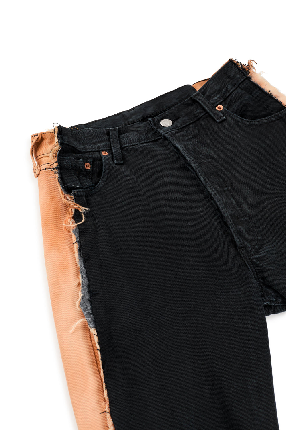 - Custom dyed: Featuring a special black and salmon color combo, with bleached black denim side panels creating a striking, one-of-a-kind cream effect.