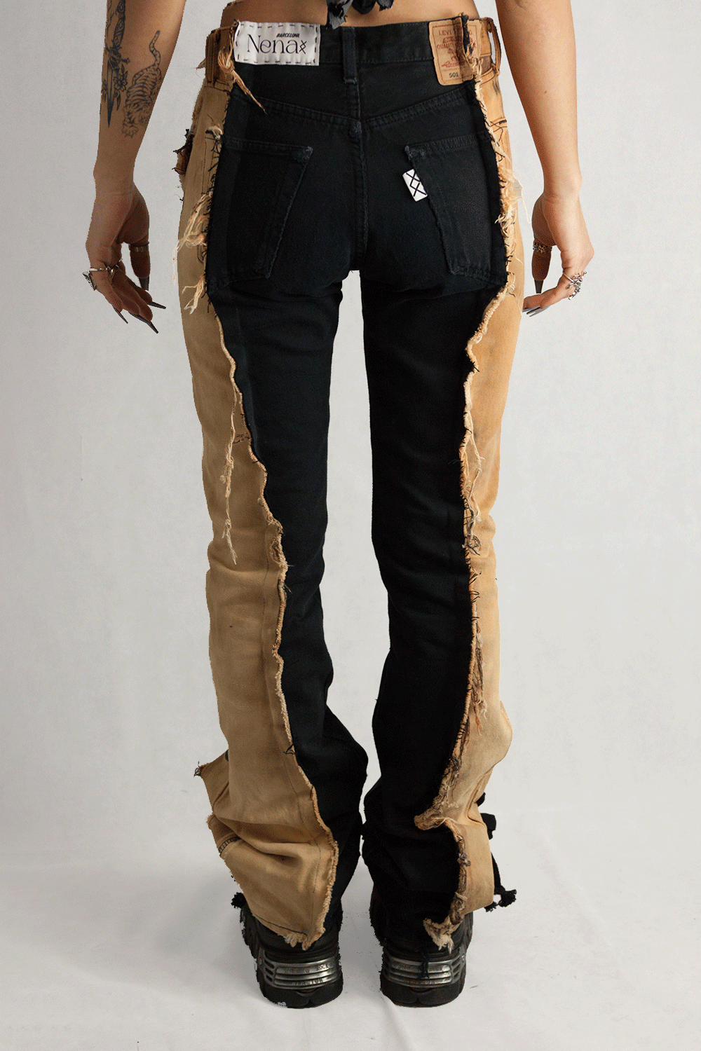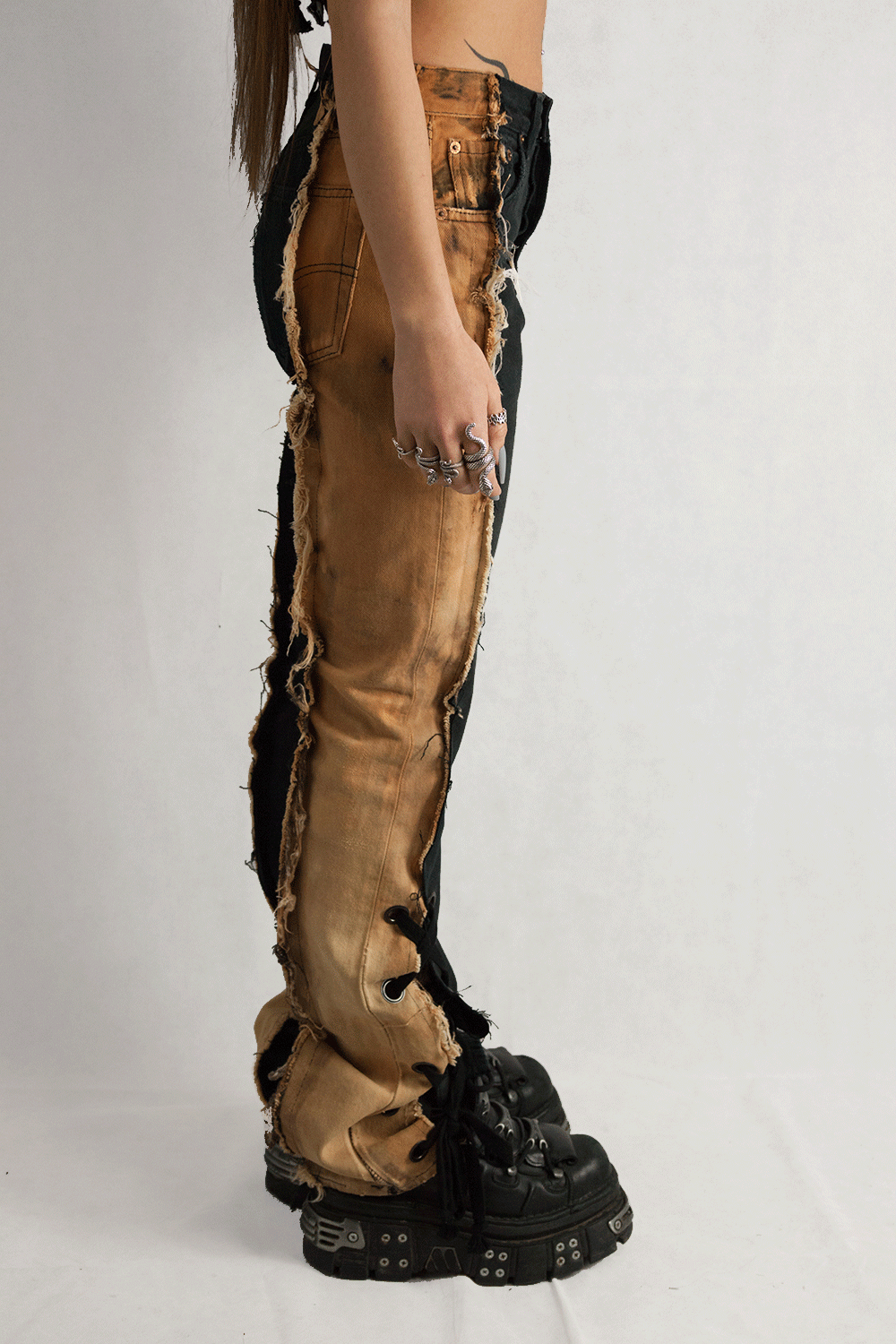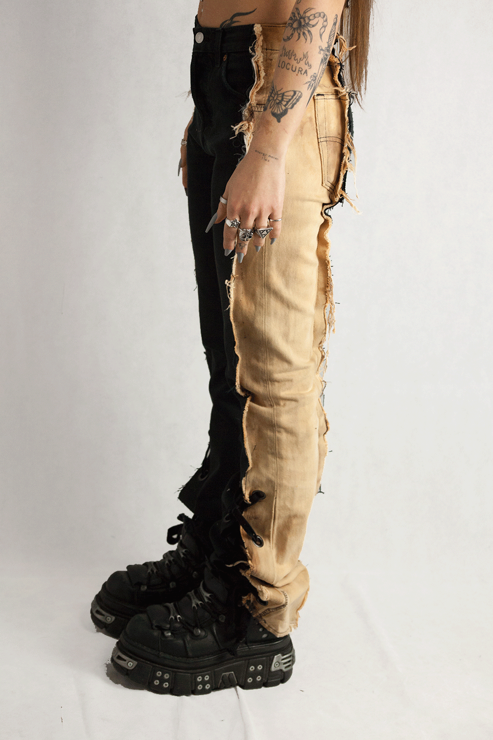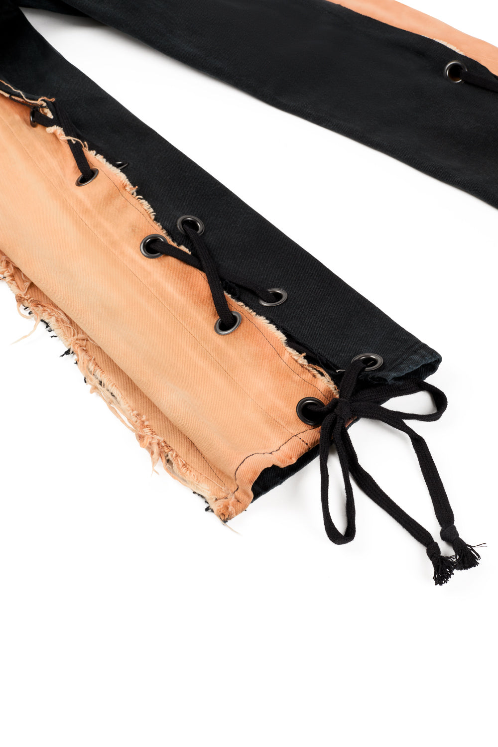 Introducing the "TOUGH" Upcycled Jeans, a bold fusion of strength, style, and sustainability. These jeans are reimagined with our signature lace-up detail, paired with an innovative, open leg end that creates a dramatic flared silhouette. Crafted from black denim, the jeans feature a striking bleach-dyed effect with salmon side panels, creating an unparalleled cream-colored contrast that gives these jeans a standout, one-of-a-kind look.