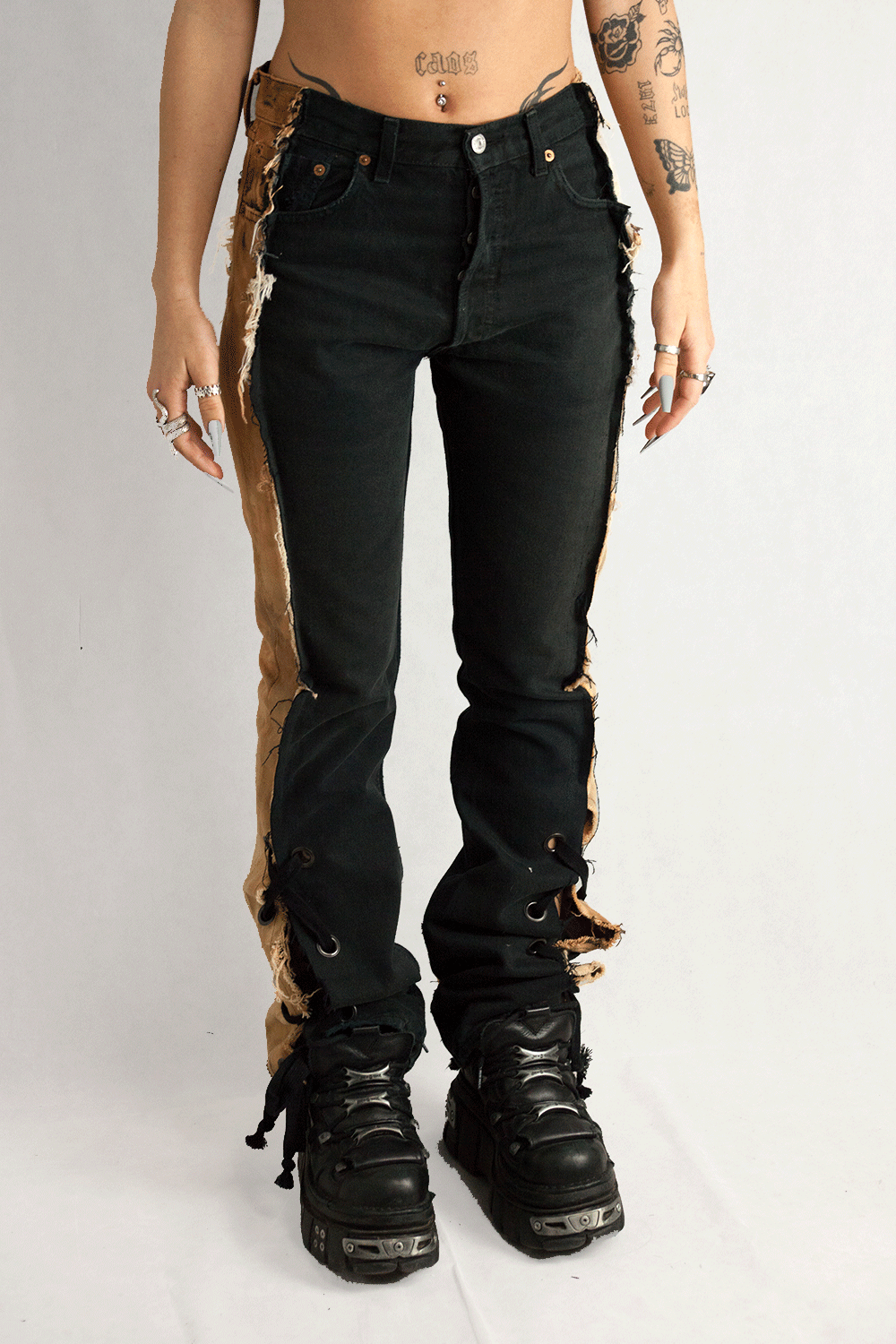 Designed for those who live loud and embrace the unconventional, these jeans are as tough as they are stylish. The unique bleached side panels and flared shape make a powerful statement on their own or when styled with our handmade SAVVY corset for an elevated, bold look.