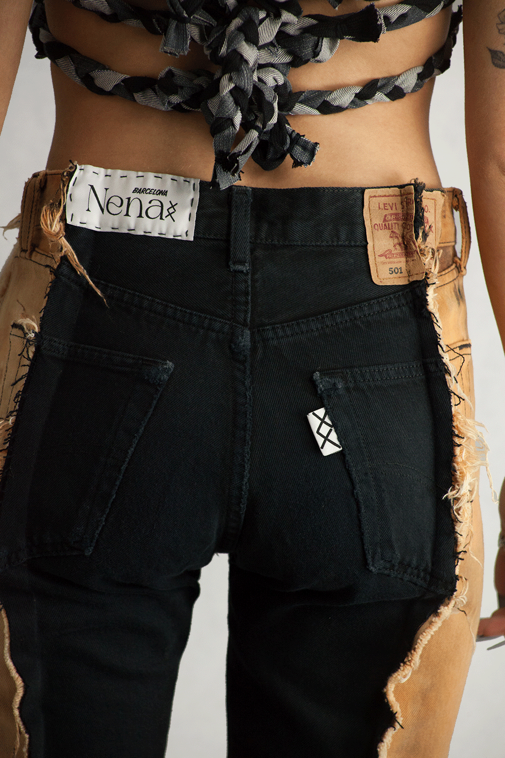 - Upcycled craftsmanship: Made from pre-loved denim and customized with a signature lace-up detail and a unique bleached and dyed process.